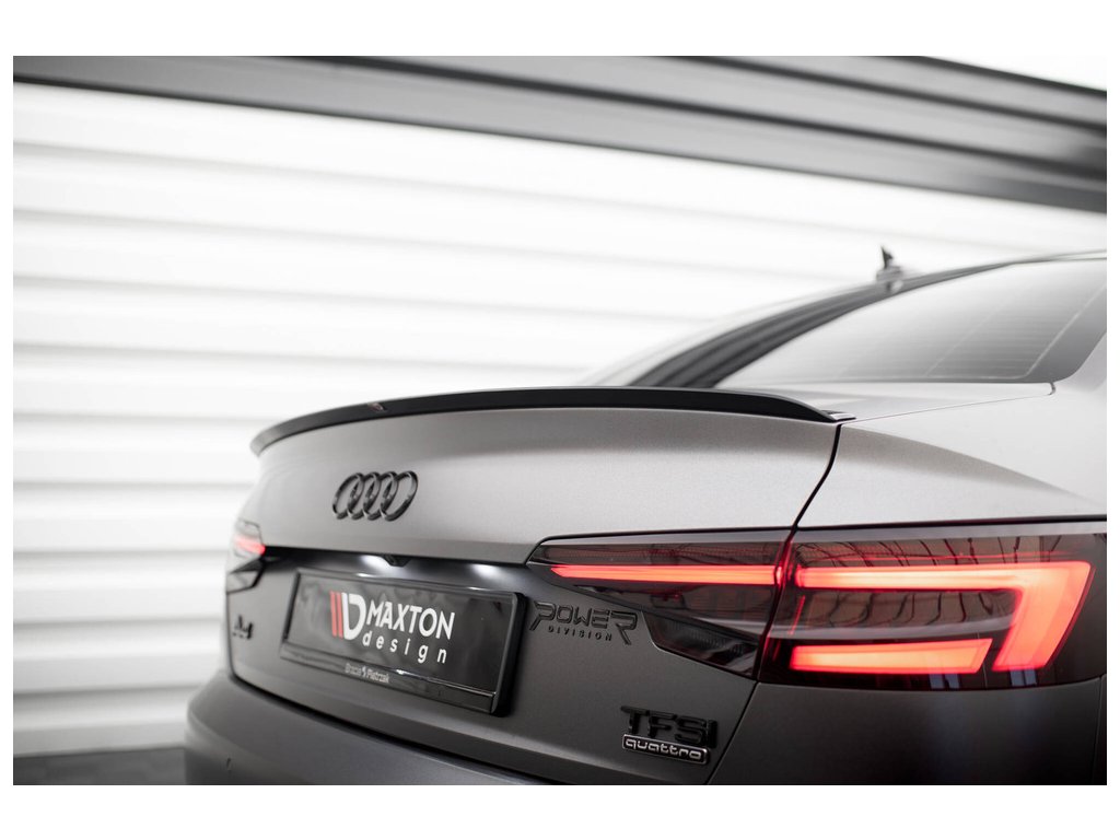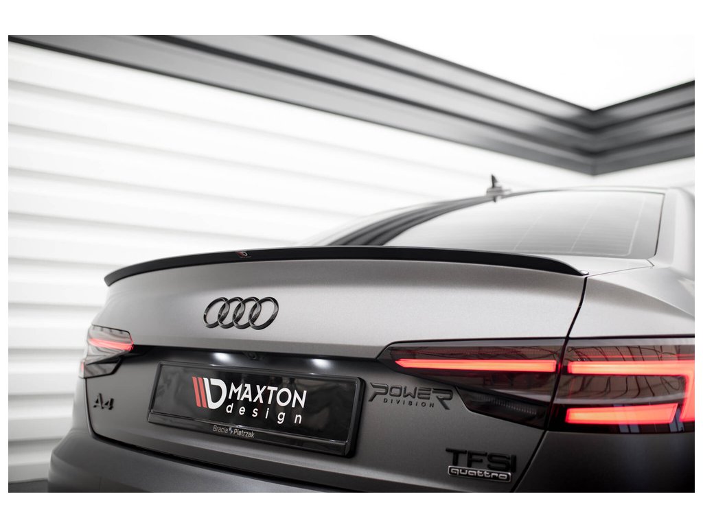 Maxton Design prodloužení spoileru pro vozidlo Audi A4 B9 . Povrchová úprava spoileru černý lesklý plast ABS.