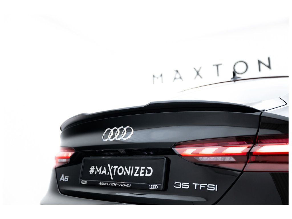 Maxton Design prodloužení spoileru pro vozidlo Audi A5 F5, F5 FL . Povrchová úprava spoileru černý lesklý plast ABS.