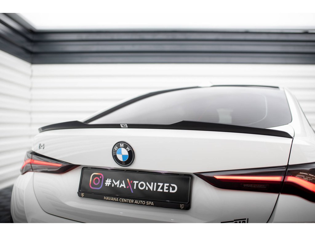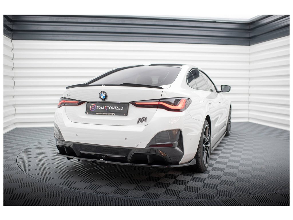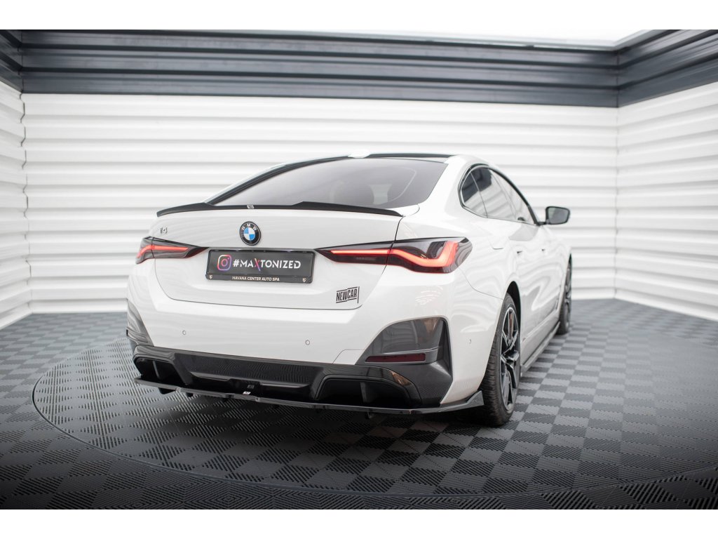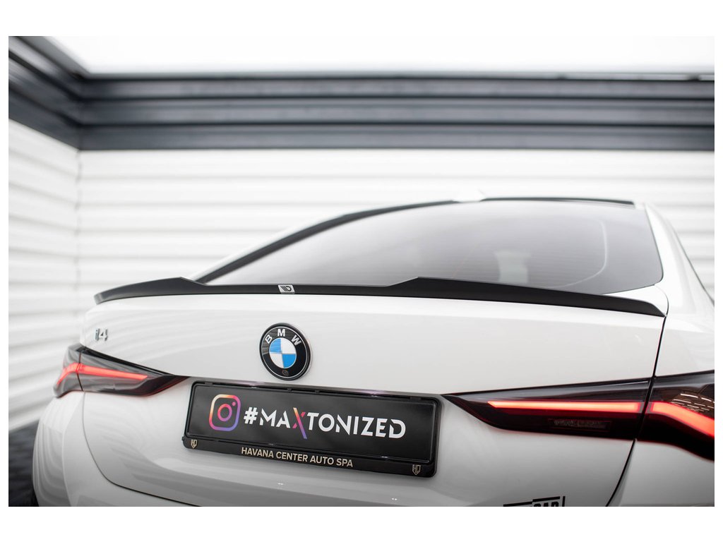 Maxton Design prodloužení spoileru pro vozidlo BMW i4 G26 M-Pack . Povrchová úprava spoileru černý lesklý plast ABS.