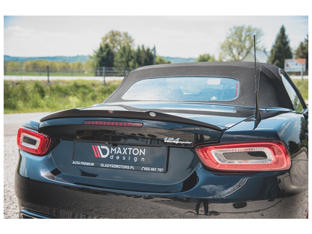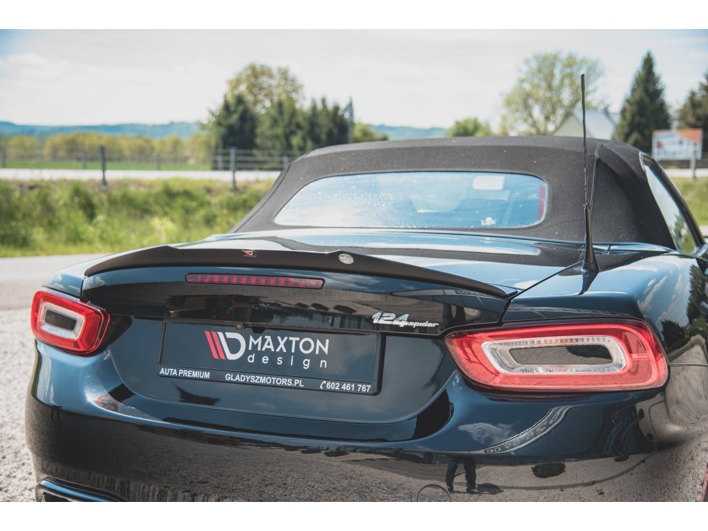 Maxton Design prodloužení spoileru pro vozidlo Fiat 124 Spider Abarth . Povrchová úprava spoileru černý lesklý plast ABS.