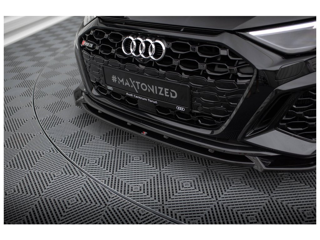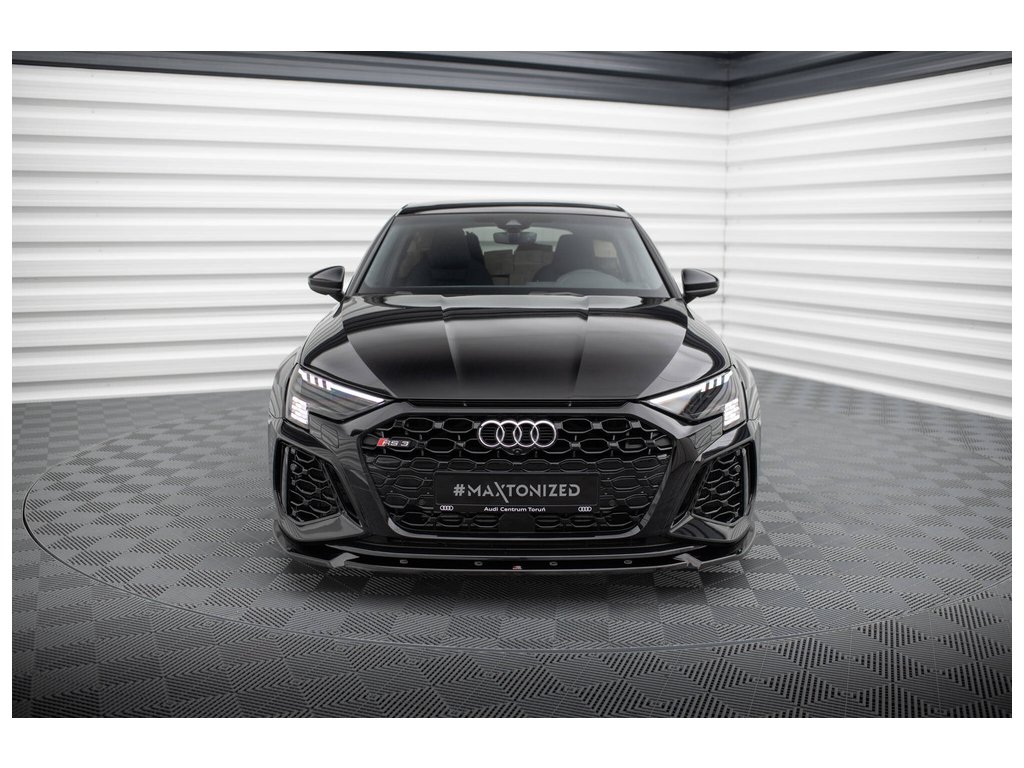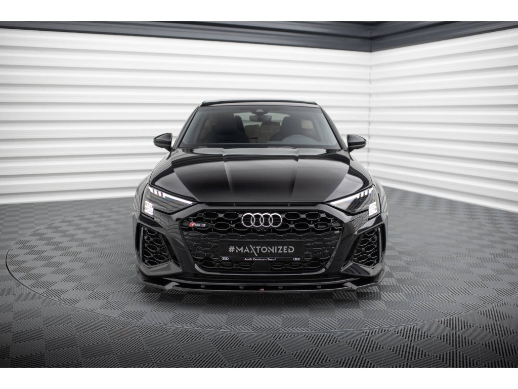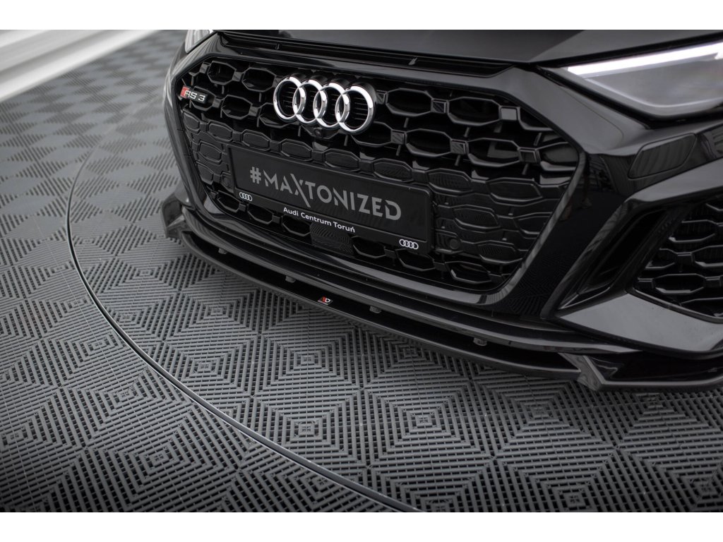 Maxton Design spoiler pod přední nárazník pro vozidlo Audi RS3 8Y . Povrchová úprava spoileru černý lesklý plast ABS.