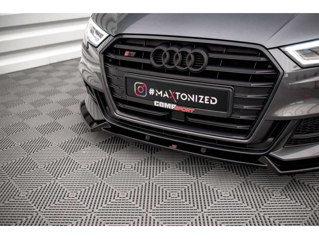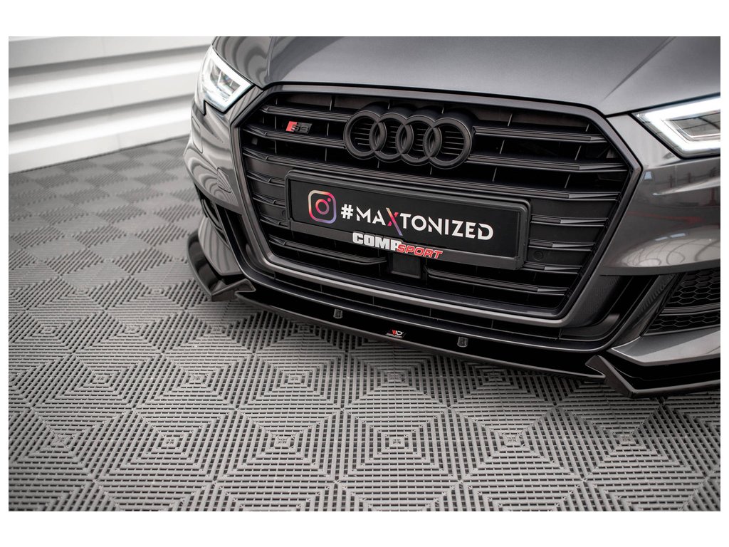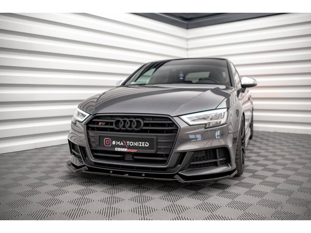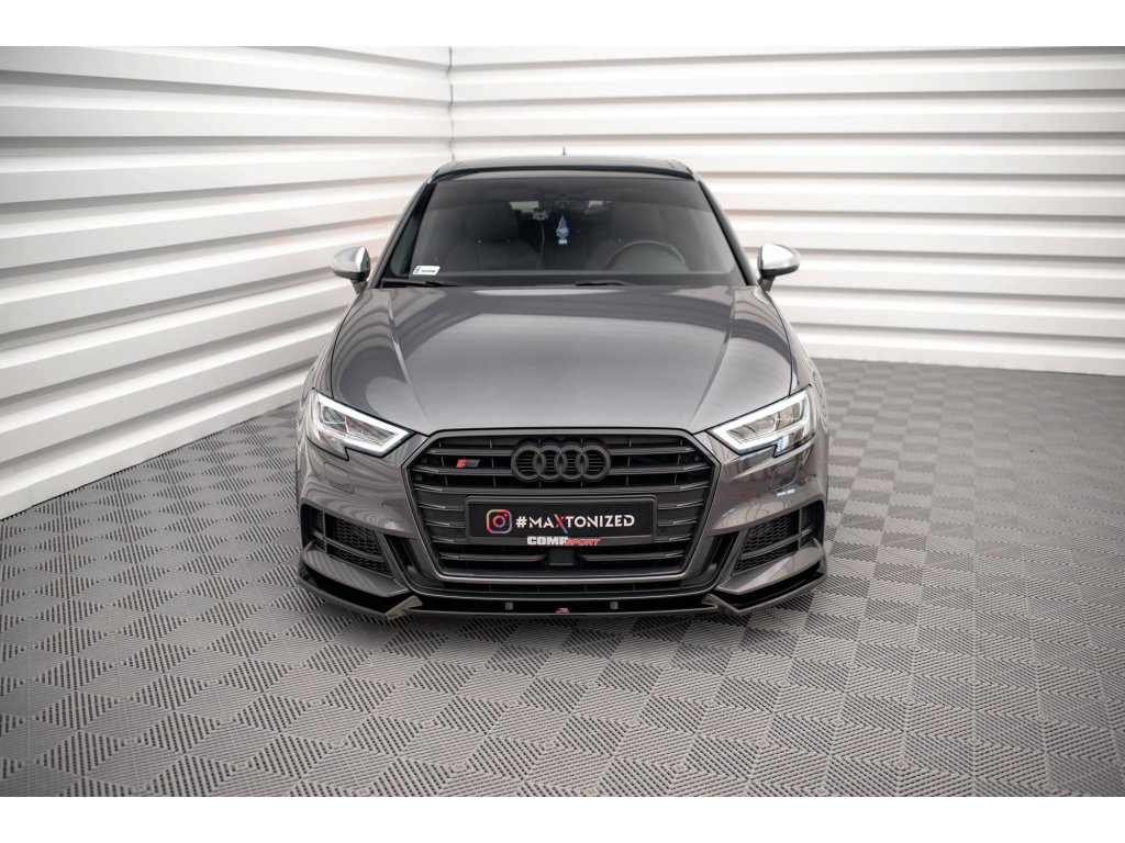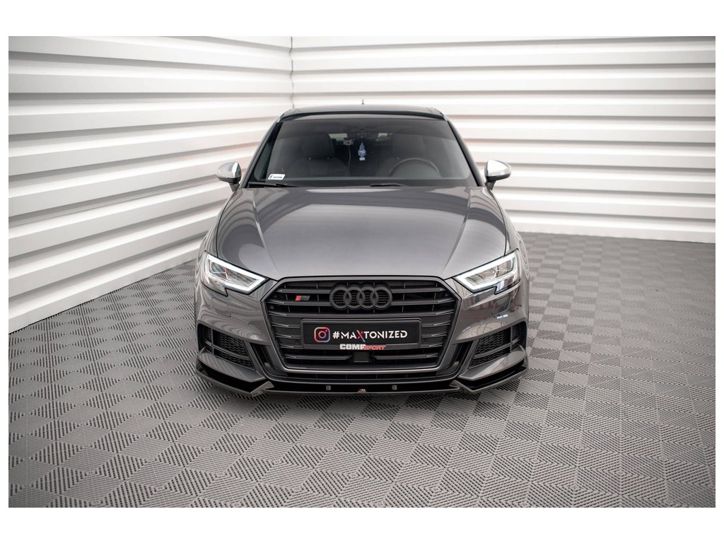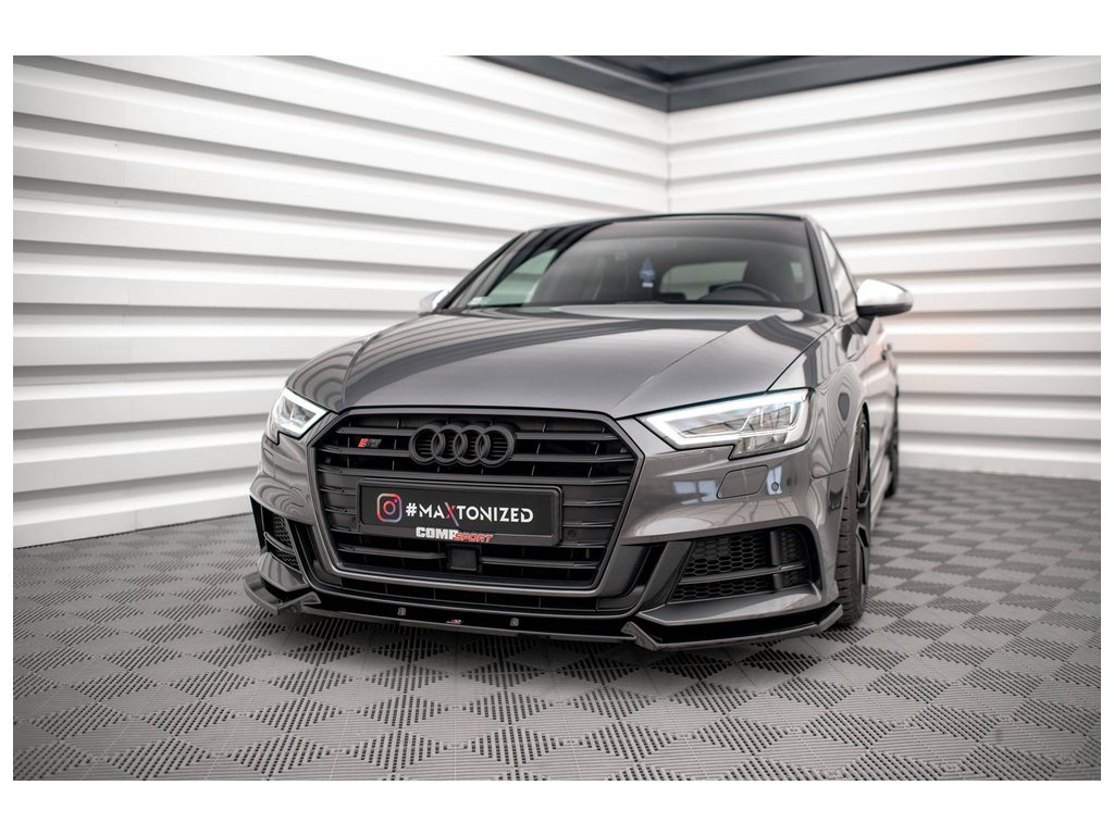 Maxton Design spoiler pod přední nárazník pro vozidlo Audi S3 8V FL . Povrchová úprava spoileru černý lesklý plast ABS.