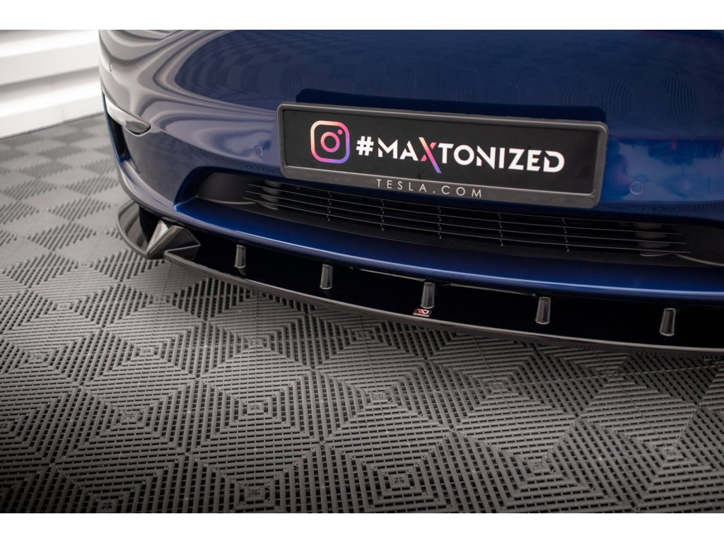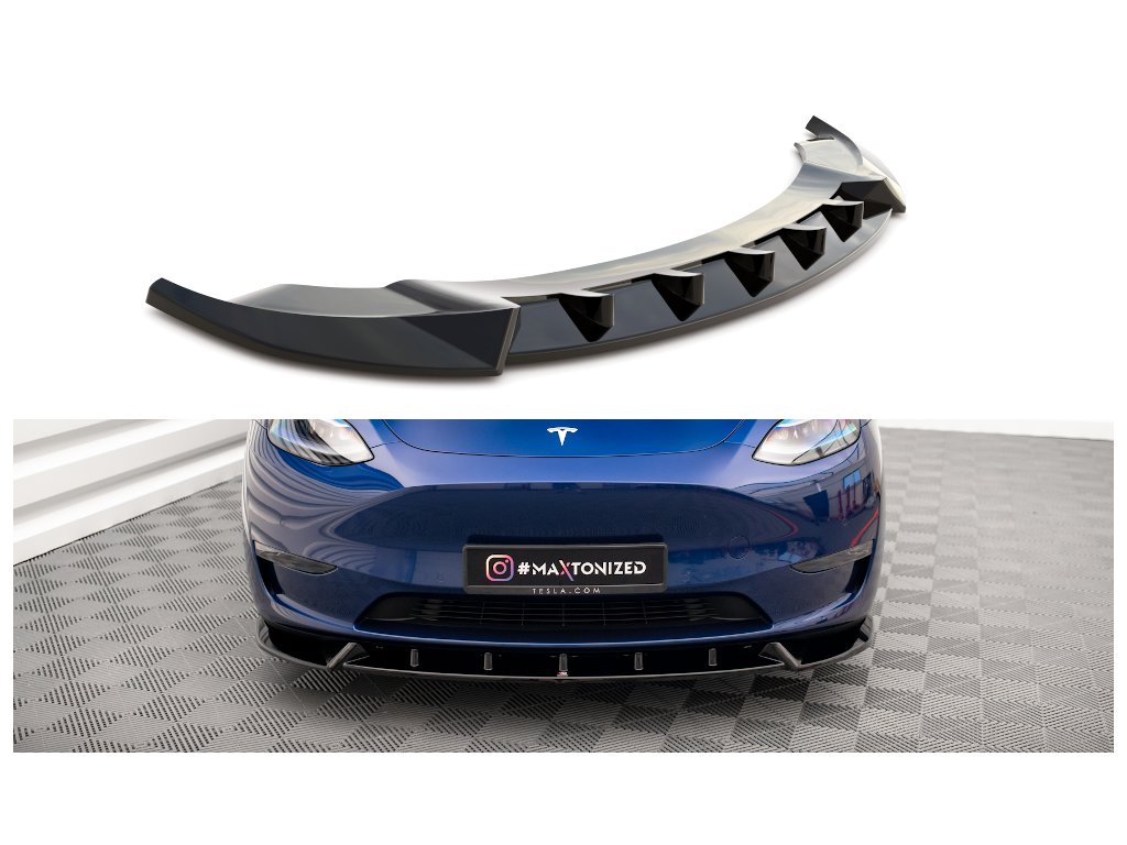 Maxton Design spoiler pod přední nárazník pro vozidlo Tesla Model Y . Povrchová úprava spoileru carbon-Look.