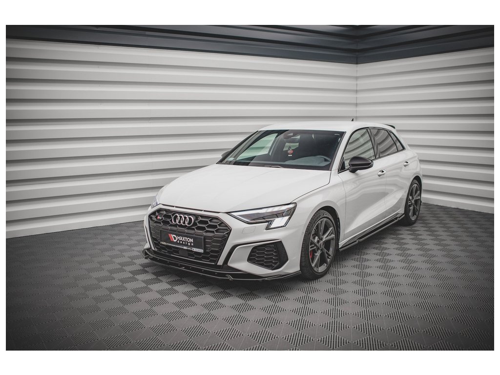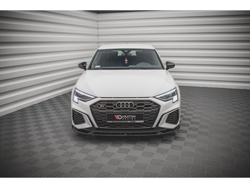 Maxton Design spoiler pod přední nárazník ver.3 pro vozidlo Audi S3 8Y . Povrchová úprava spoileru černý lesklý plast ABS.