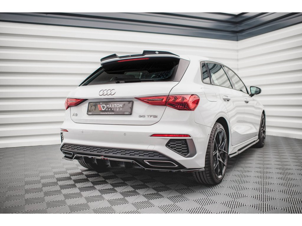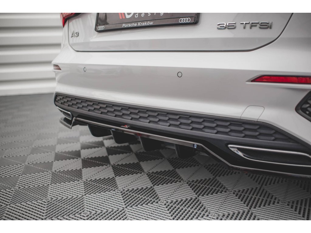Maxton Design středový spoiler pod zadní nárazník s žebrováním pro vozidlo Audi A3 8Y . Povrchová úprava spoileru carbon-Look.