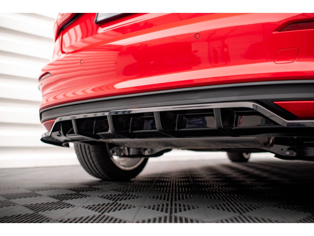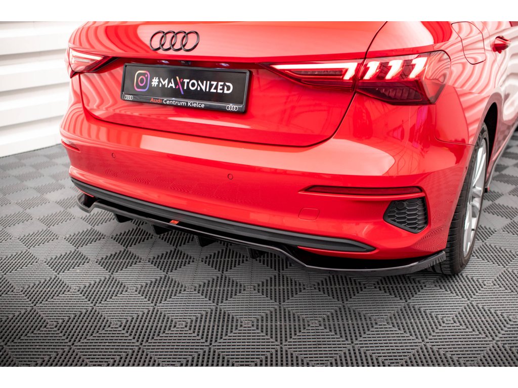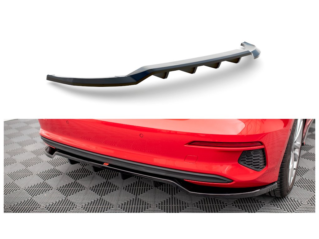 Maxton Design středový spoiler pod zadní nárazník s žebrováním pro vozidlo Audi A3 8Y . Povrchová úprava spoileru carbon-Look.