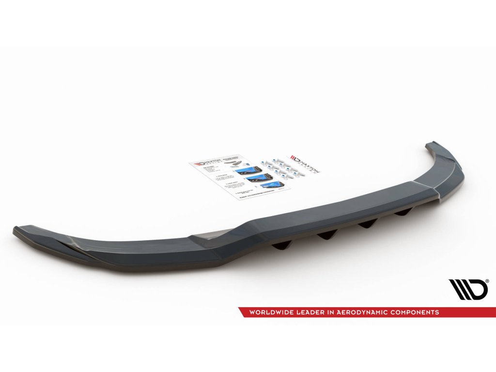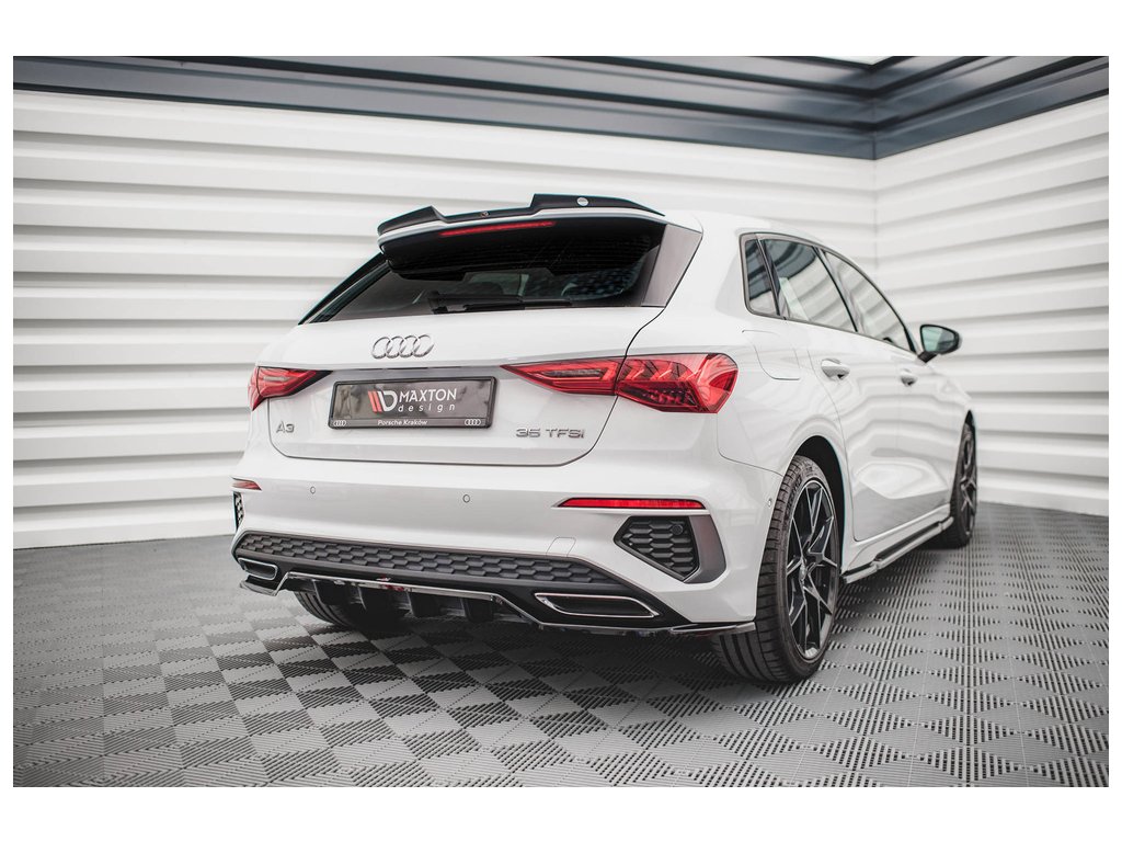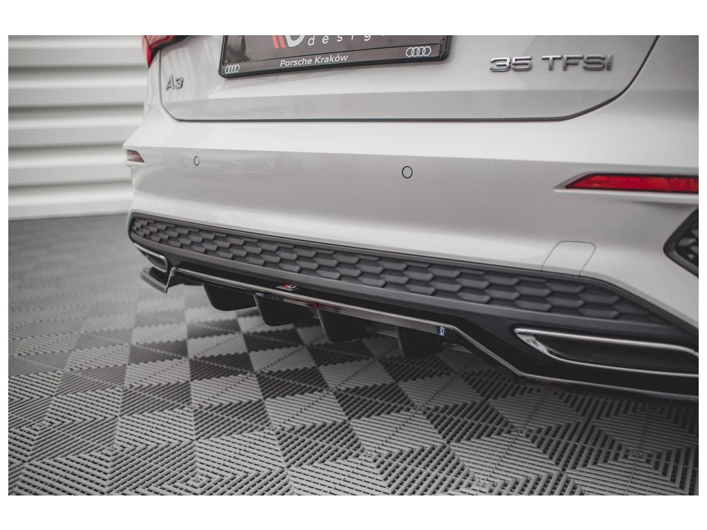 Maxton Design středový spoiler pod zadní nárazník s žebrováním pro vozidlo Audi A3 8Y . Povrchová úprava spoileru černý lesklý plast ABS.