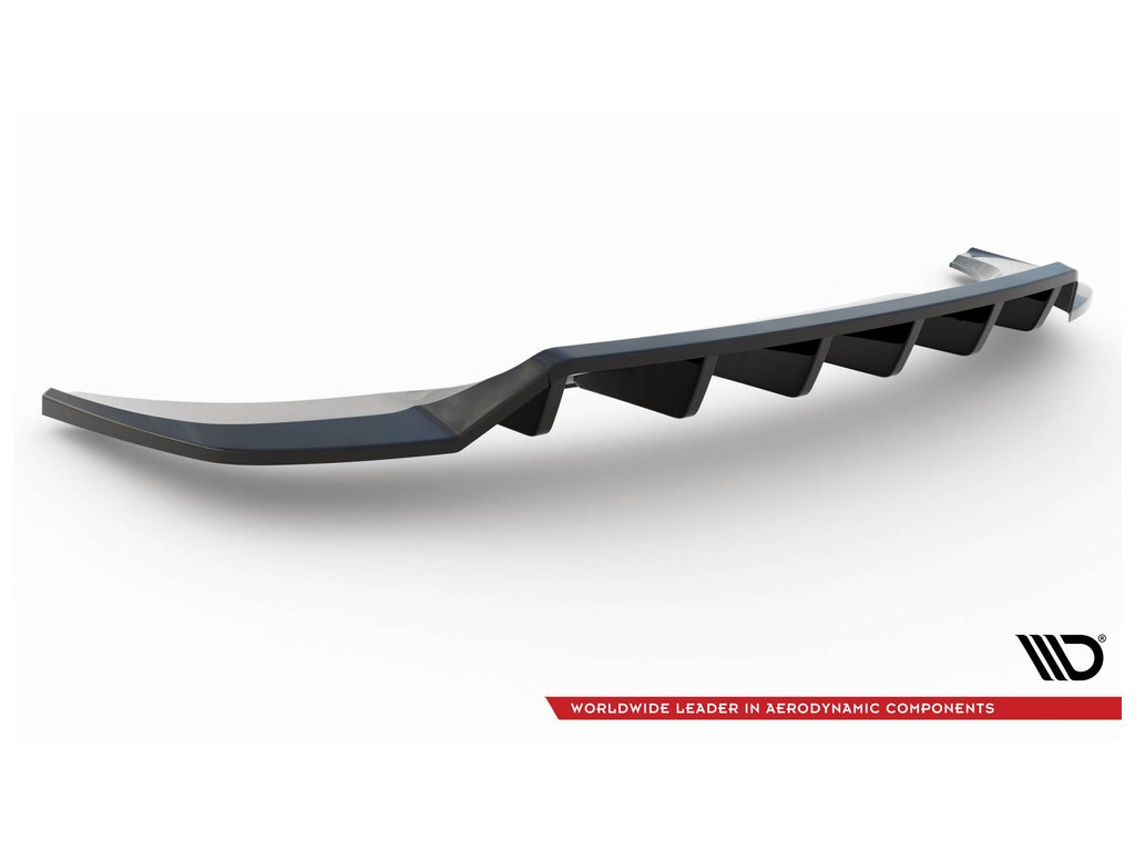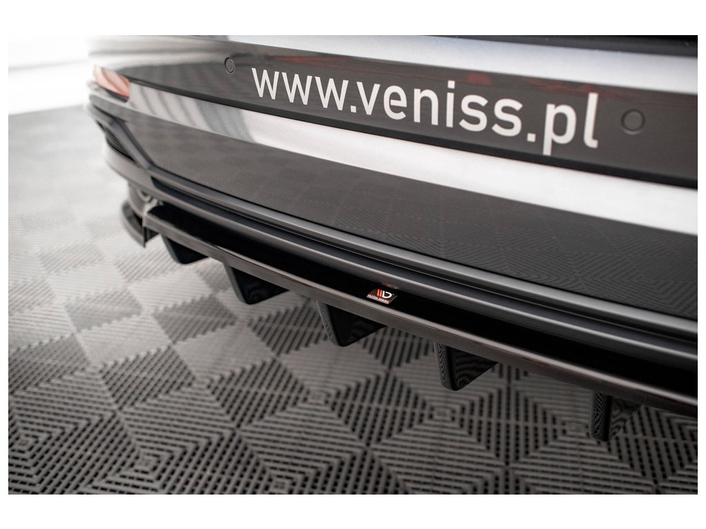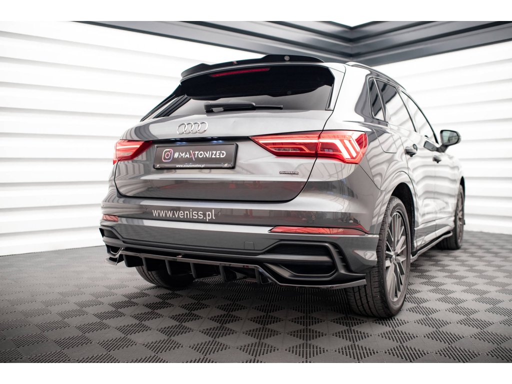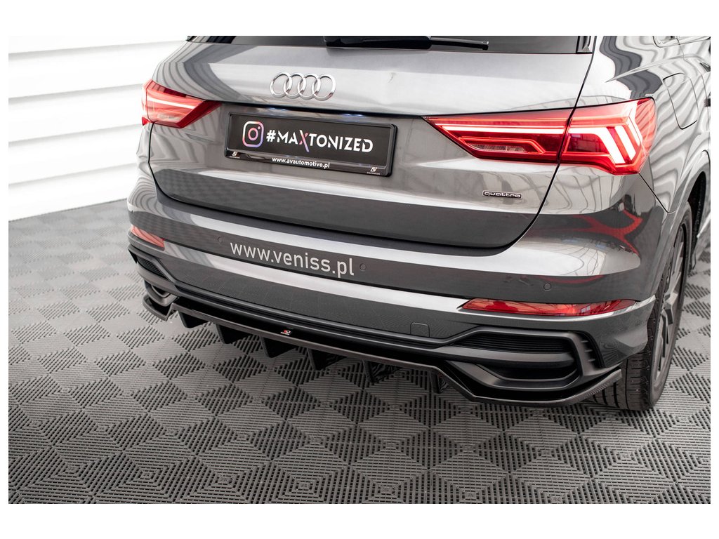 Maxton Design středový spoiler pod zadní nárazník s žebrováním pro vozidlo Audi Q3 F3 S-Line . Povrchová úprava spoileru černý lesklý plast ABS.