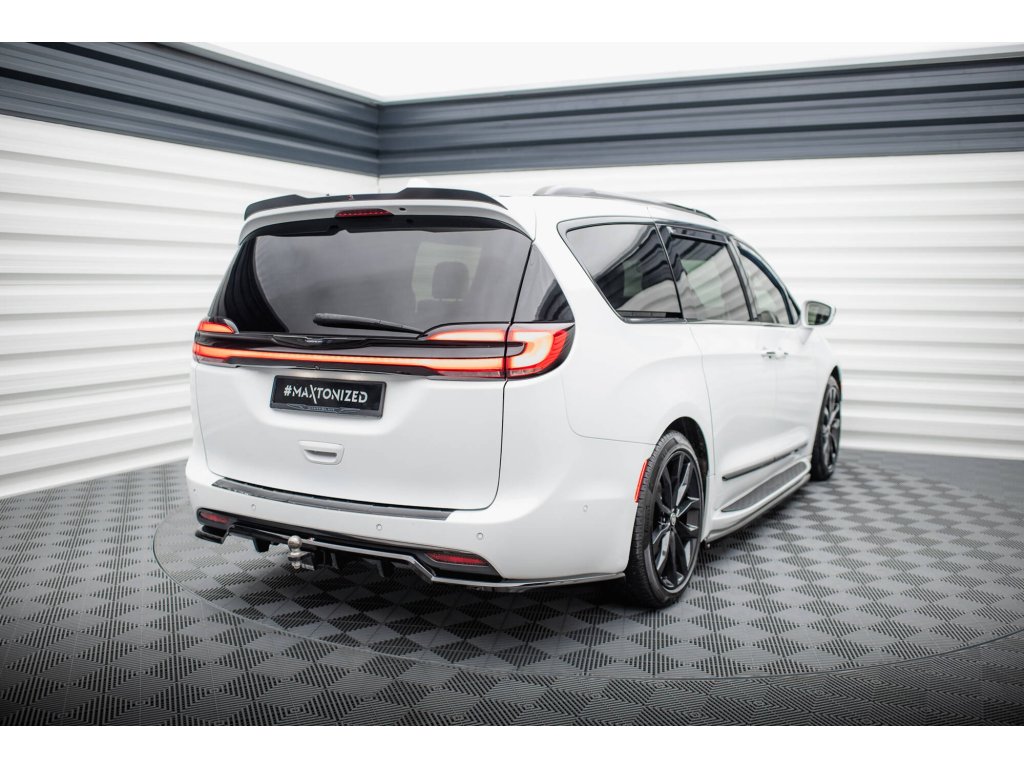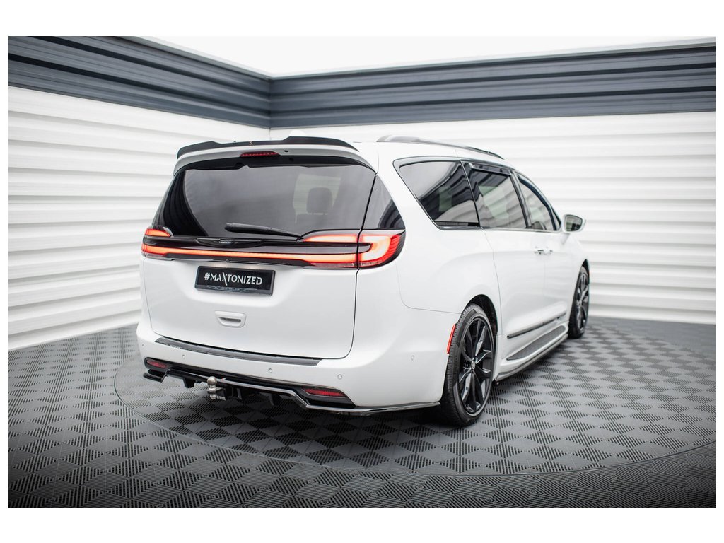 Maxton Design středový spoiler pod zadní nárazník s žebrováním pro vozidlo Chrysler Pacifica Mk2 Facelift . Povrchová úprava spoileru černý lesklý plast ABS.