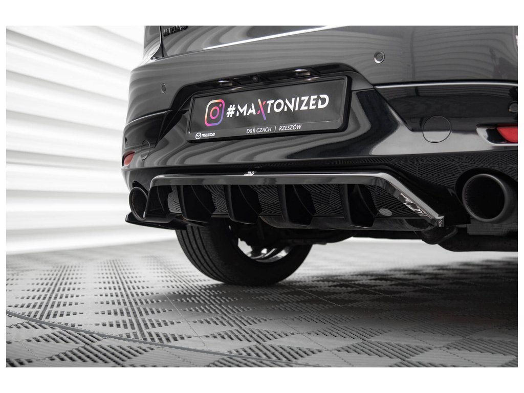 Maxton Design středový spoiler pod zadní nárazník s žebrováním pro vozidlo Mazda 3 Mk4 . Povrchová úprava spoileru černý lesklý plast ABS.