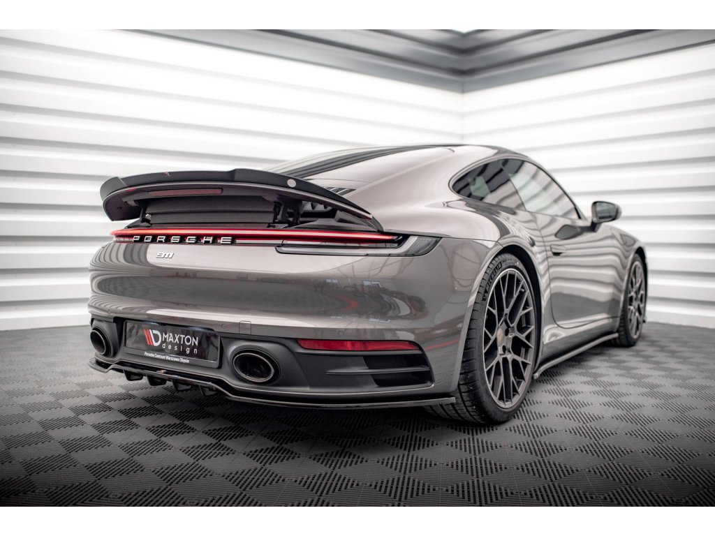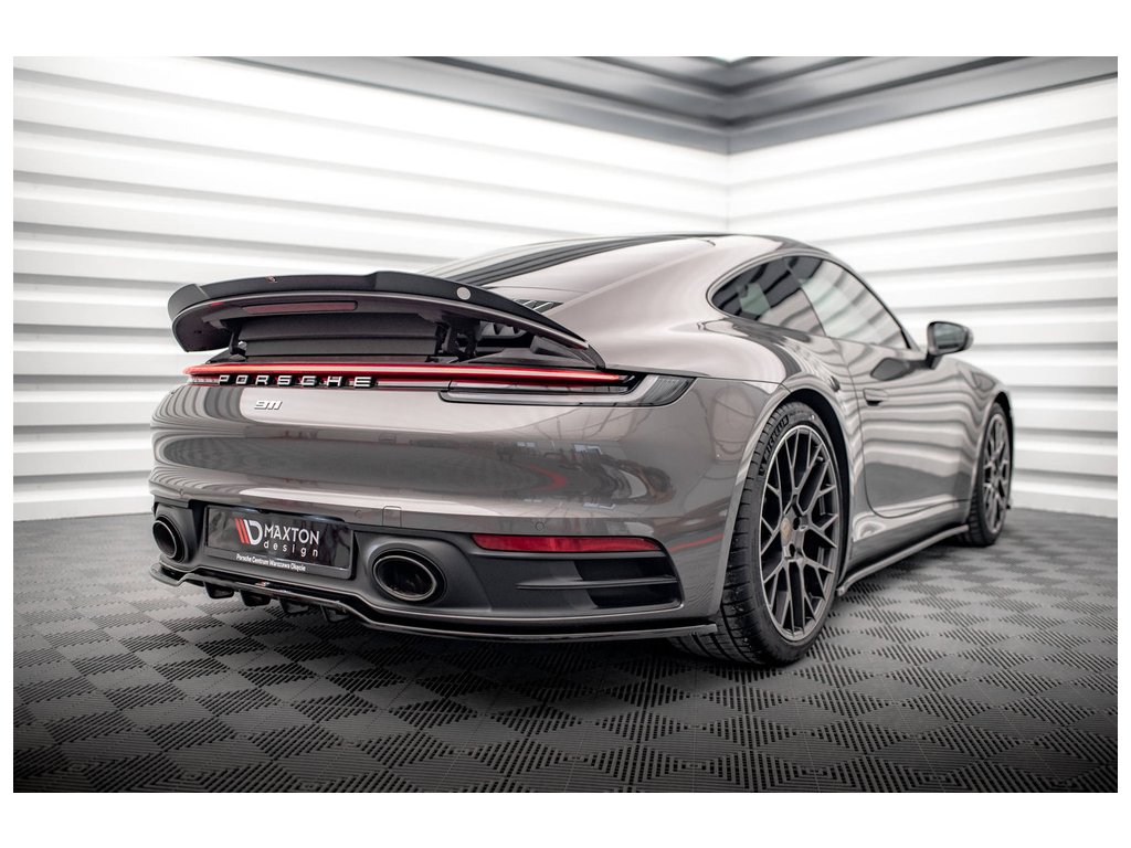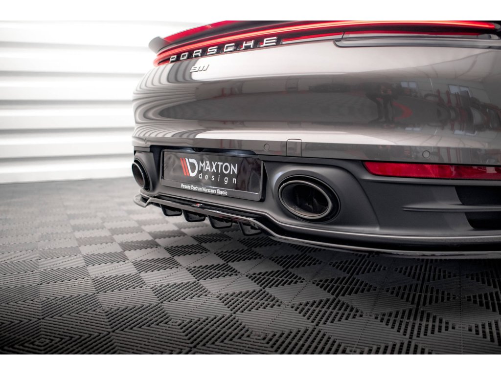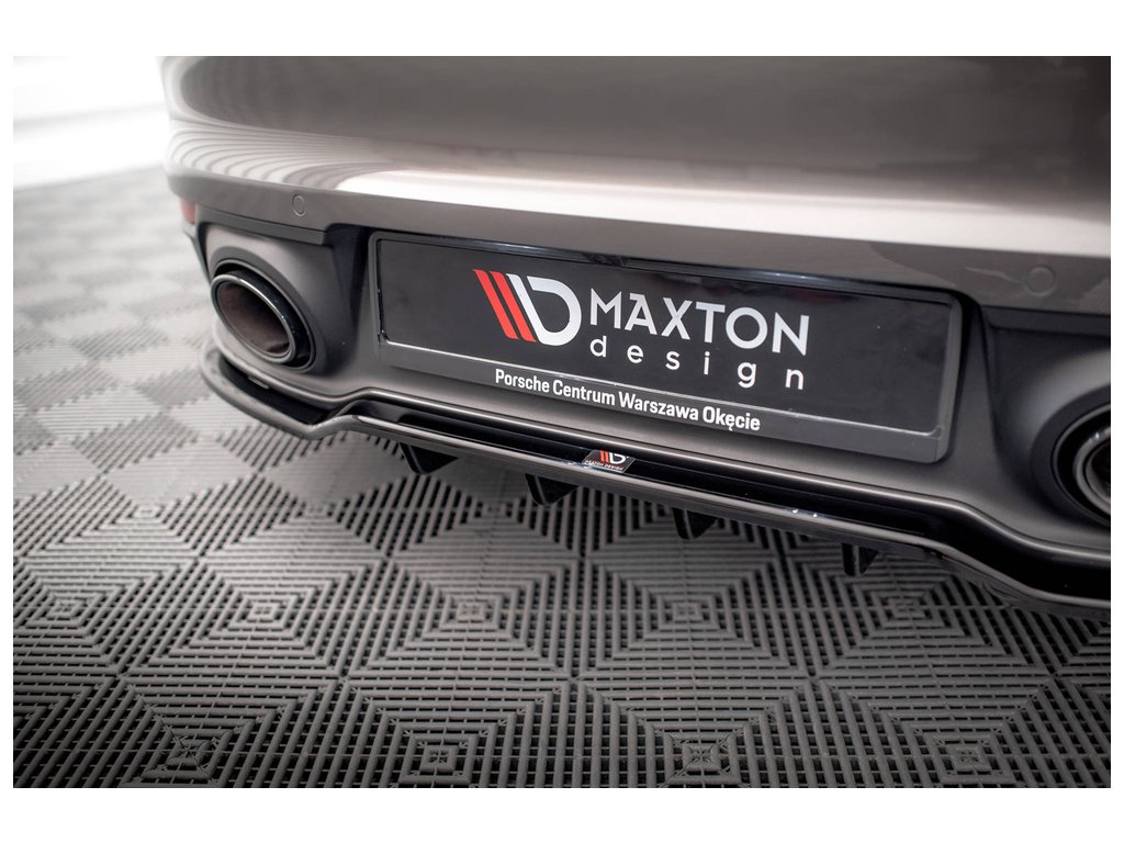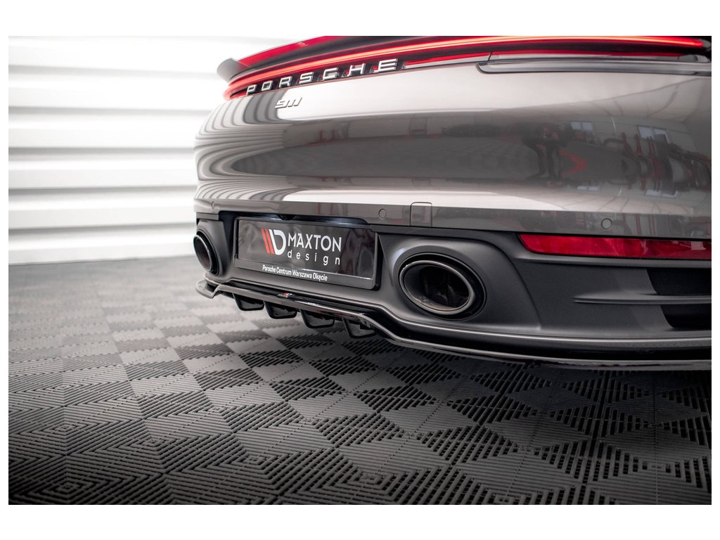 Maxton Design středový spoiler pod zadní nárazník s žebrováním pro vozidlo Porsche 911 992 /Carrera 4S . Povrchová úprava spoileru černý lesklý plast ABS.