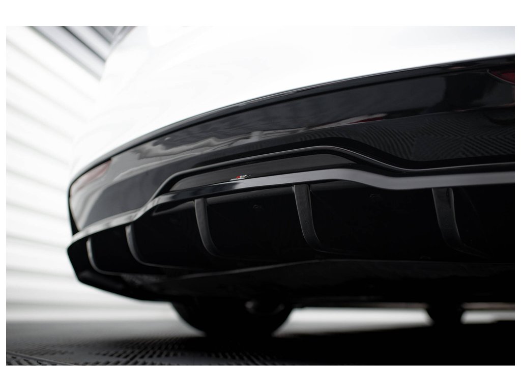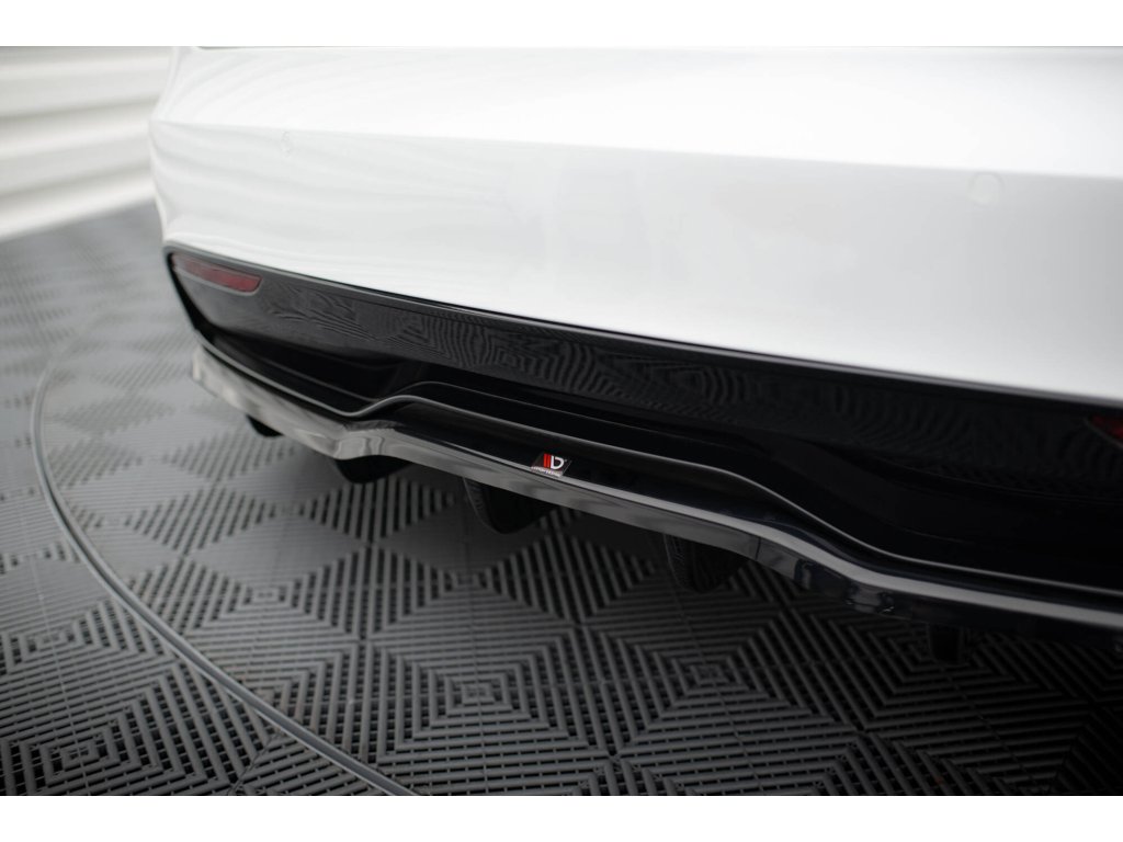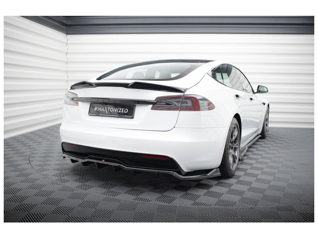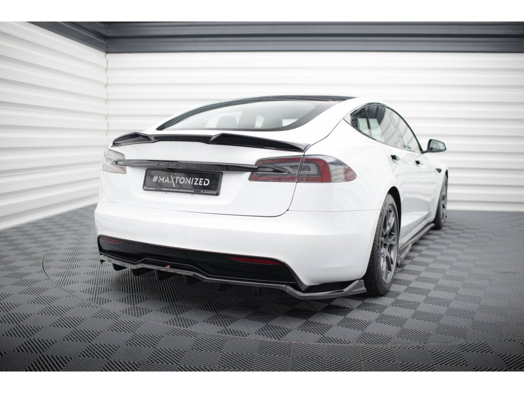 Maxton Design středový spoiler pod zadní nárazník s žebrováním v.1 pro vozidlo Tesla Model S Plaid Mk1 Facelift . Povrchová úprava spoileru černý lesklý plast ABS.