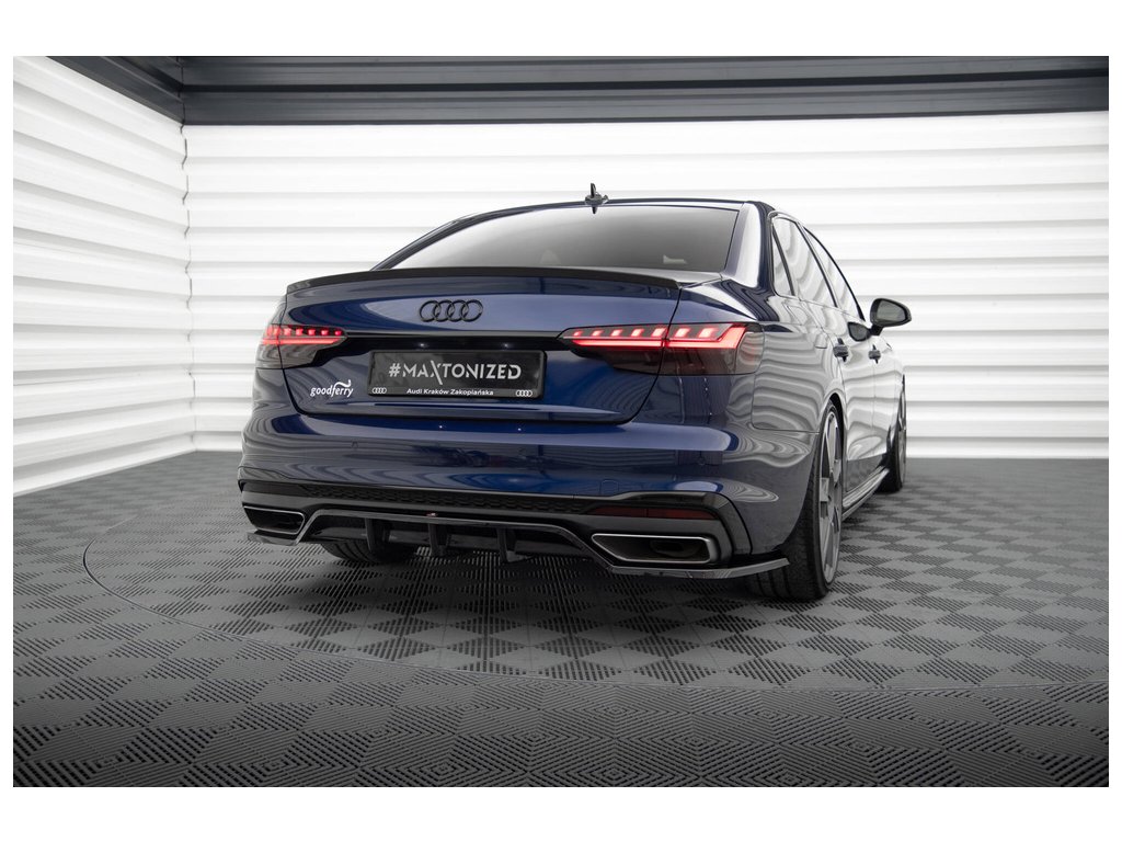 Maxton Design středový spoiler pod zadní nárazník s žebrováním v.2 pro vozidlo Audi A4 B9 FL . Povrchová úprava spoileru černý lesklý plast ABS.