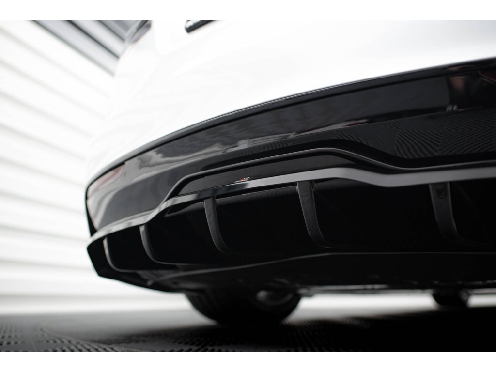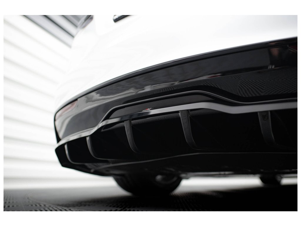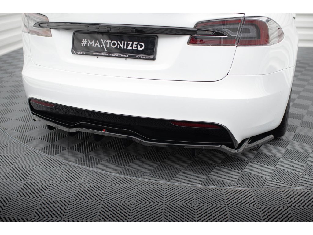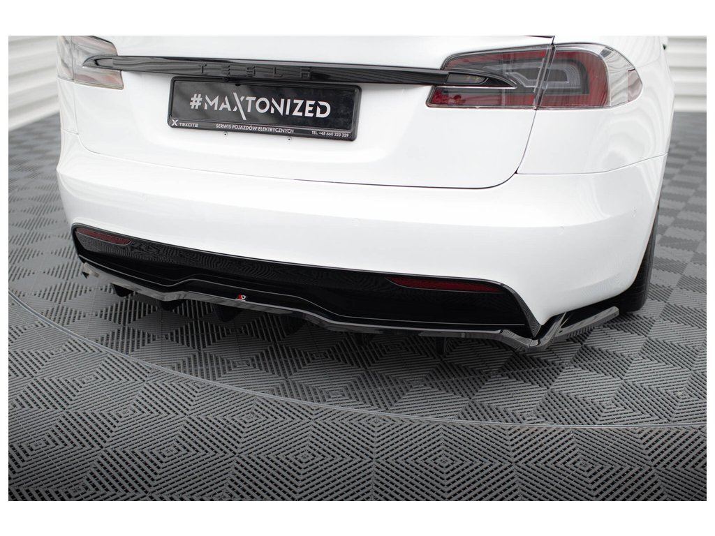 Maxton Design středový spoiler pod zadní nárazník s žebrováním v.2 pro vozidlo Tesla Model S Plaid Mk1 Facelift . Povrchová úprava spoileru černý lesklý plast ABS.
