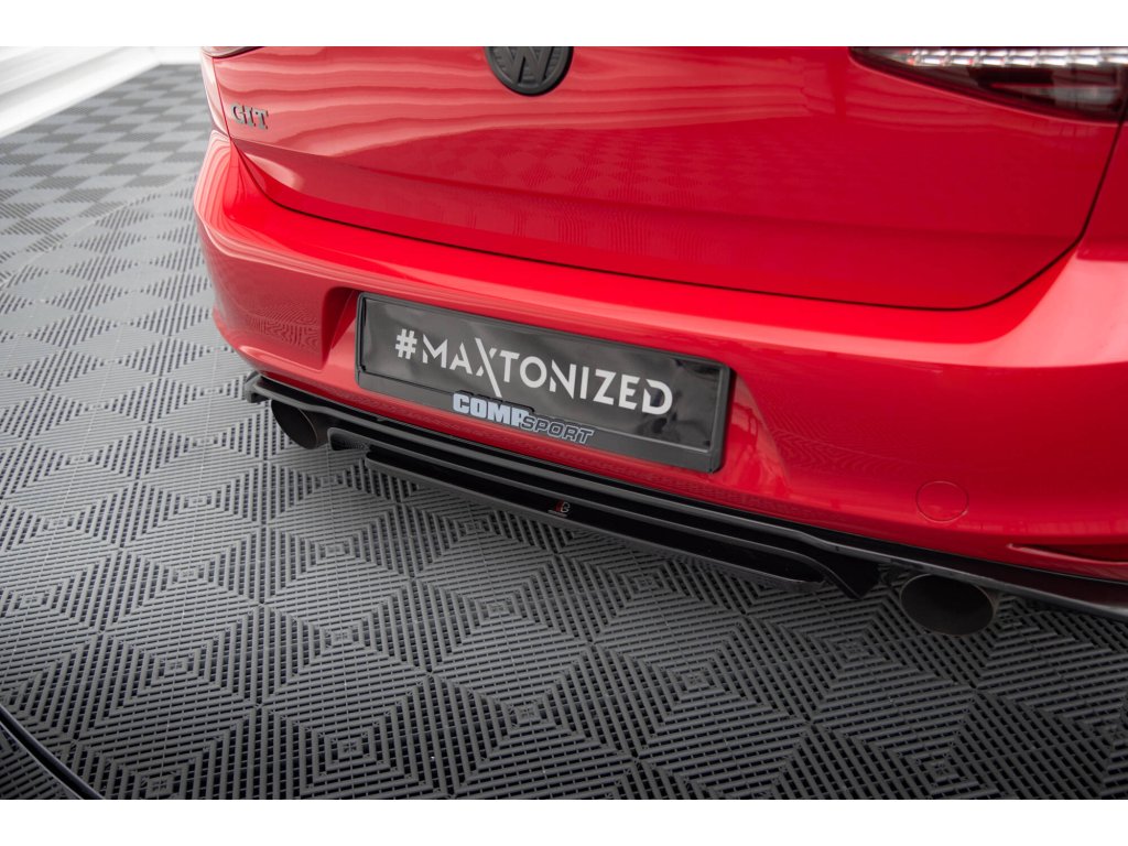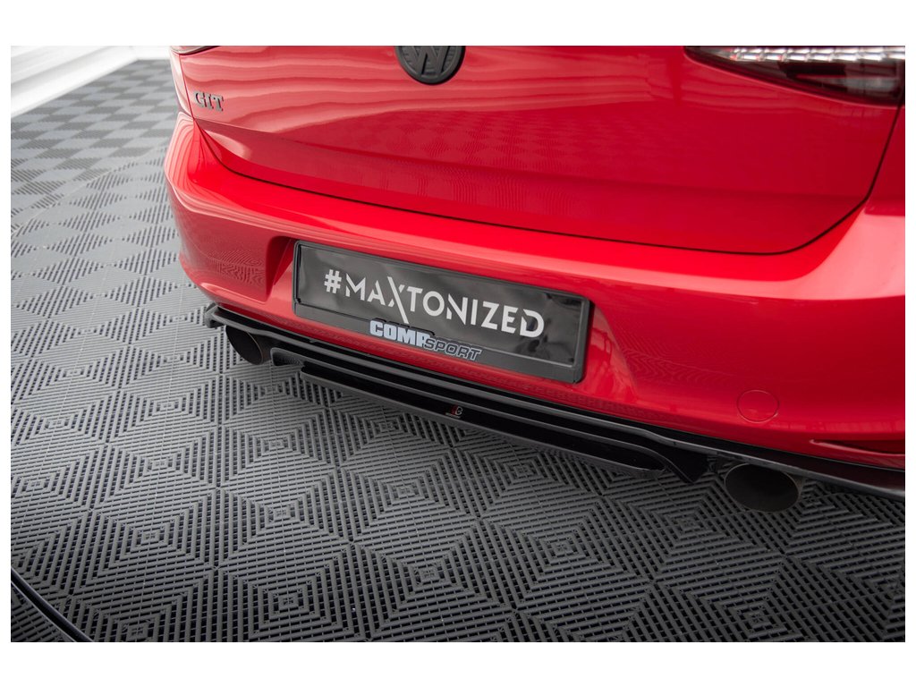 Maxton Design středový spoiler zadního nárazníku pro vozidlo Volkswagen Golf GTI Mk7 . Povrchová úprava spoileru červený lesklý plast ABS.