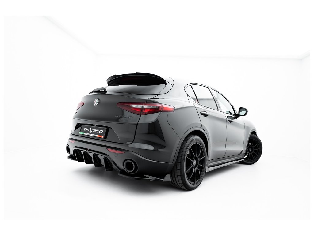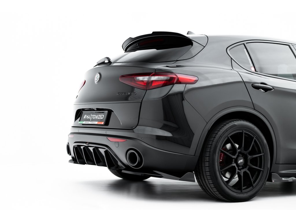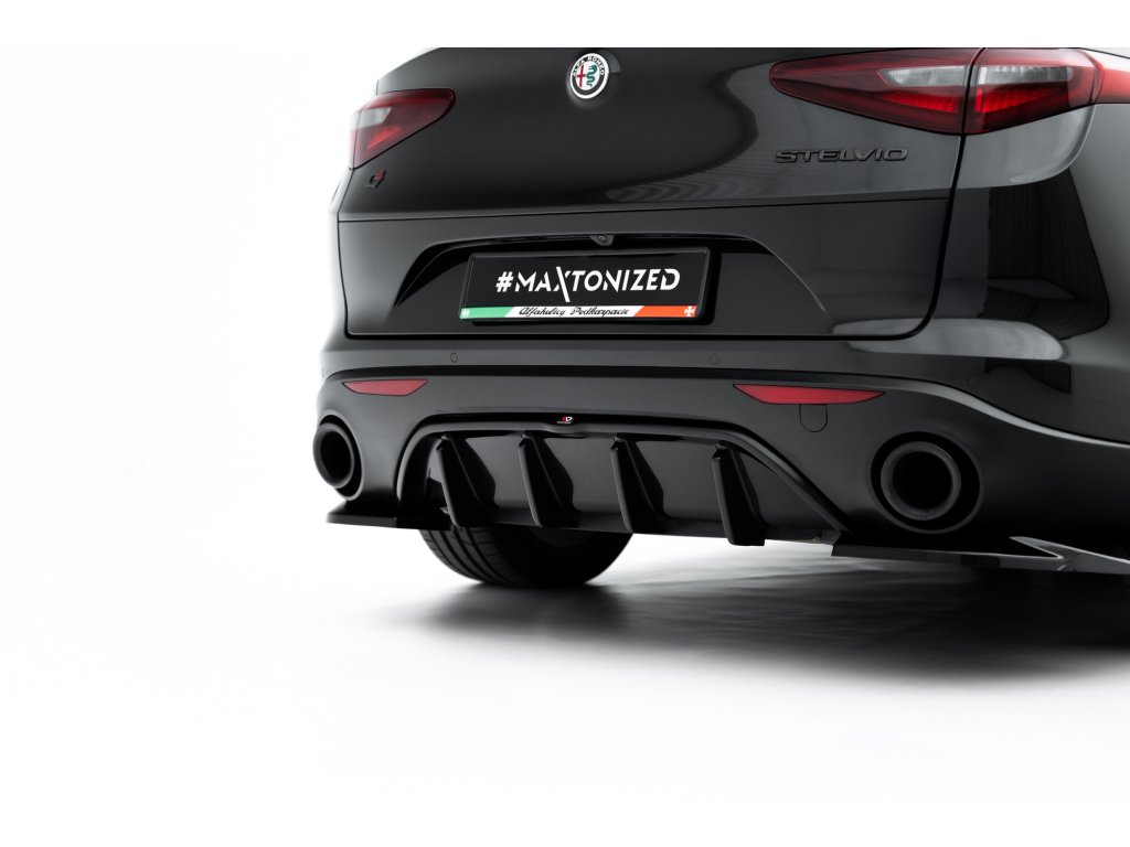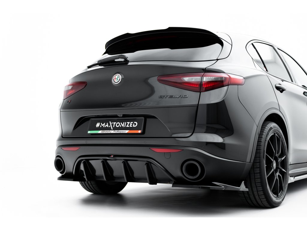 Maxton Design vložka zadního nárazníku pro vozidlo Alfa Romeo Stelvio . Povrchová úprava spoileru černý lesklý plast ABS.