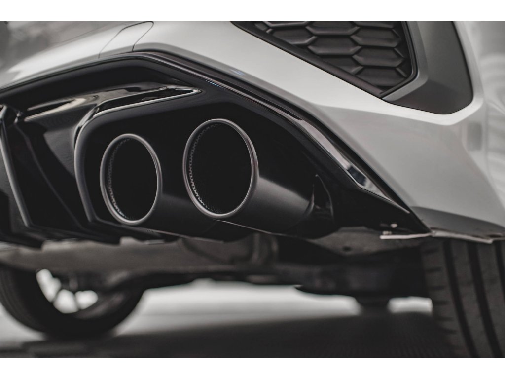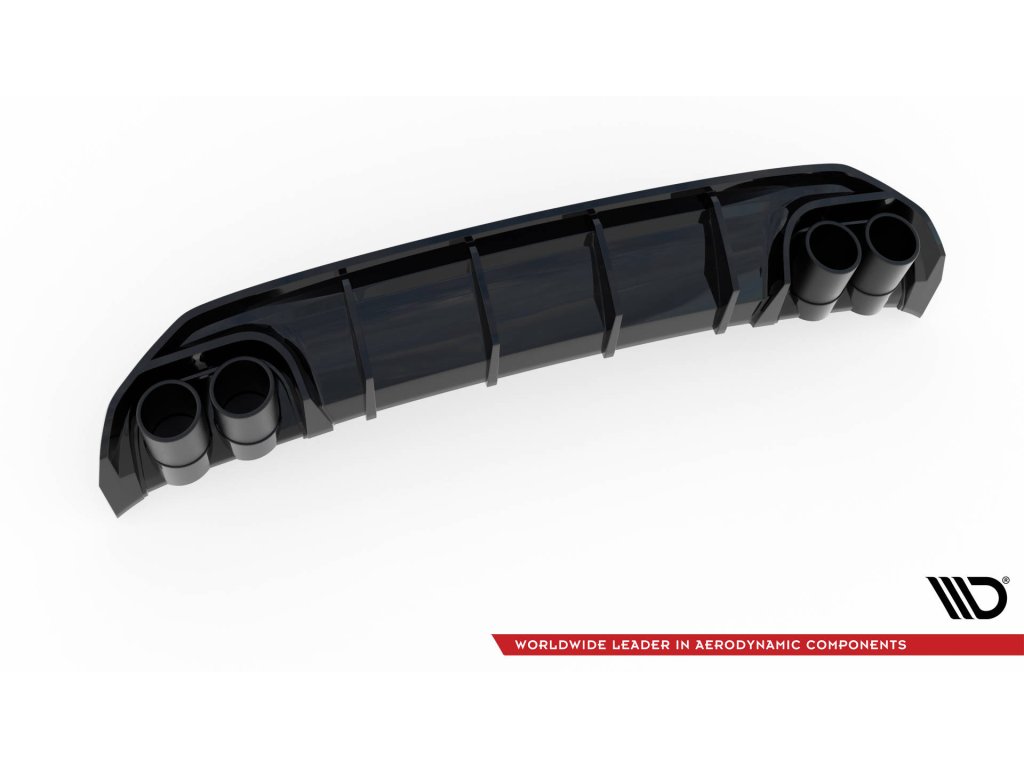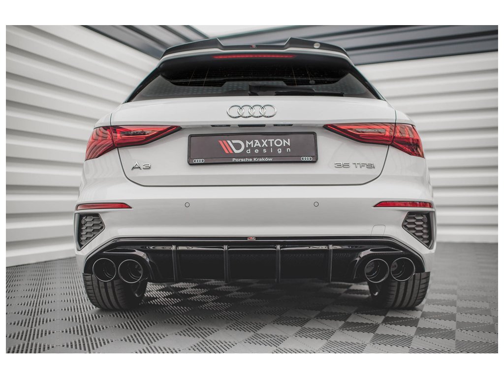 Maxton Design vložka zadního nárazníku s imitacemi koncovek výfuku pro vozidlo Audi A3 8Y . Povrchová úprava spoileru černý lesklý plast ABS.
