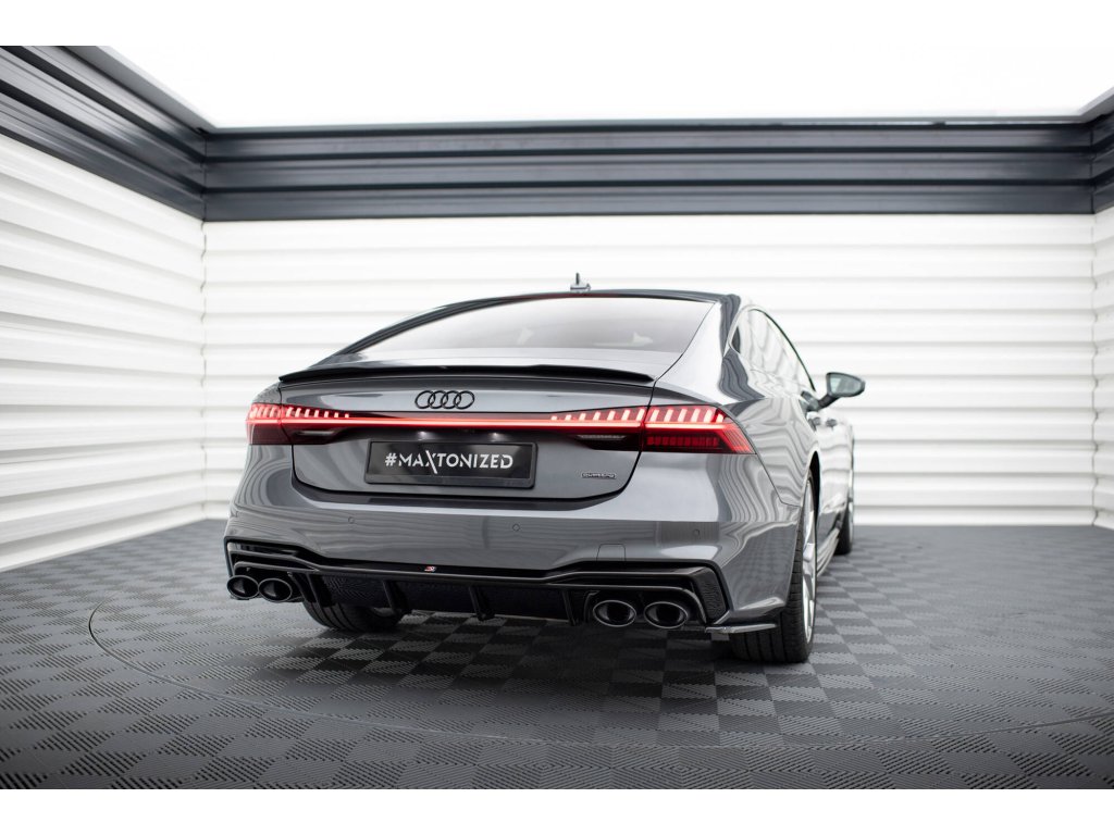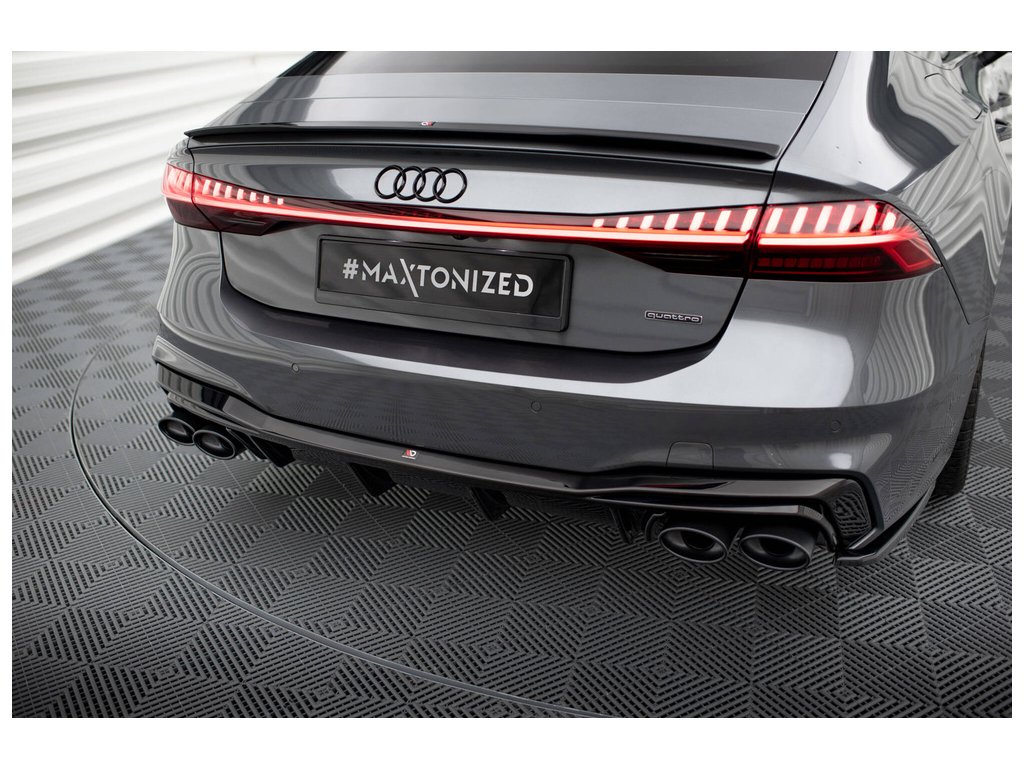 Maxton Design vložka zadního nárazníku s imitacemi koncovek výfuku pro vozidlo Audi A7 C8 S-Line . Povrchová úprava spoileru černý lesklý plast ABS.