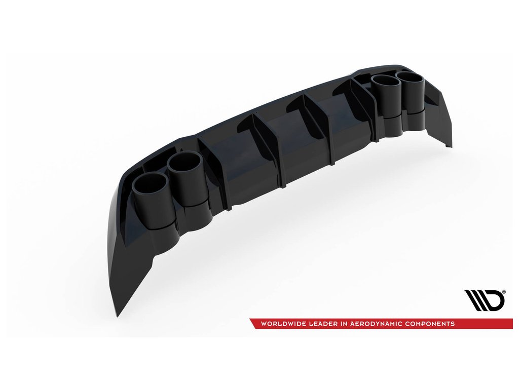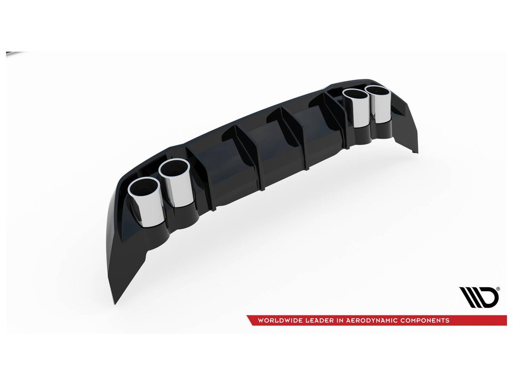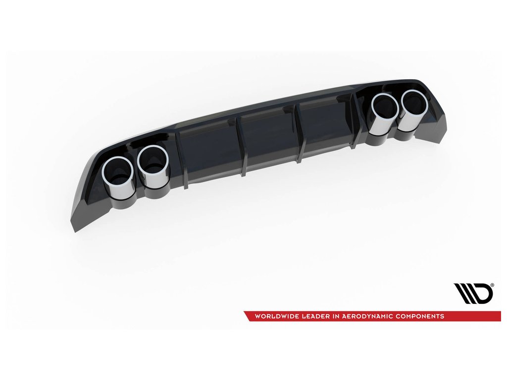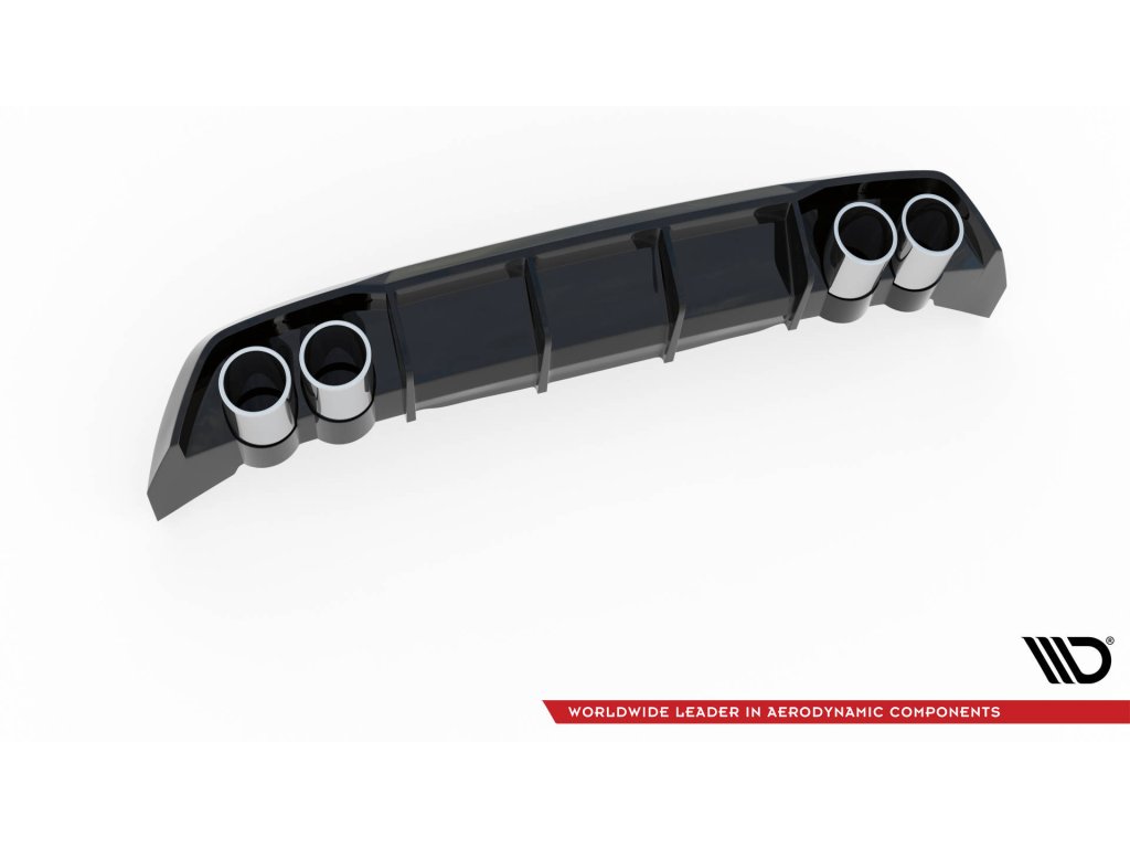 Maxton Design vložka zadního nárazníku s imitacemi koncovek výfuku pro vozidlo Seat Leon FR Mk4 . Povrchová úprava spoileru černý lesklý plast ABS.