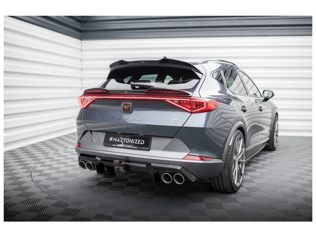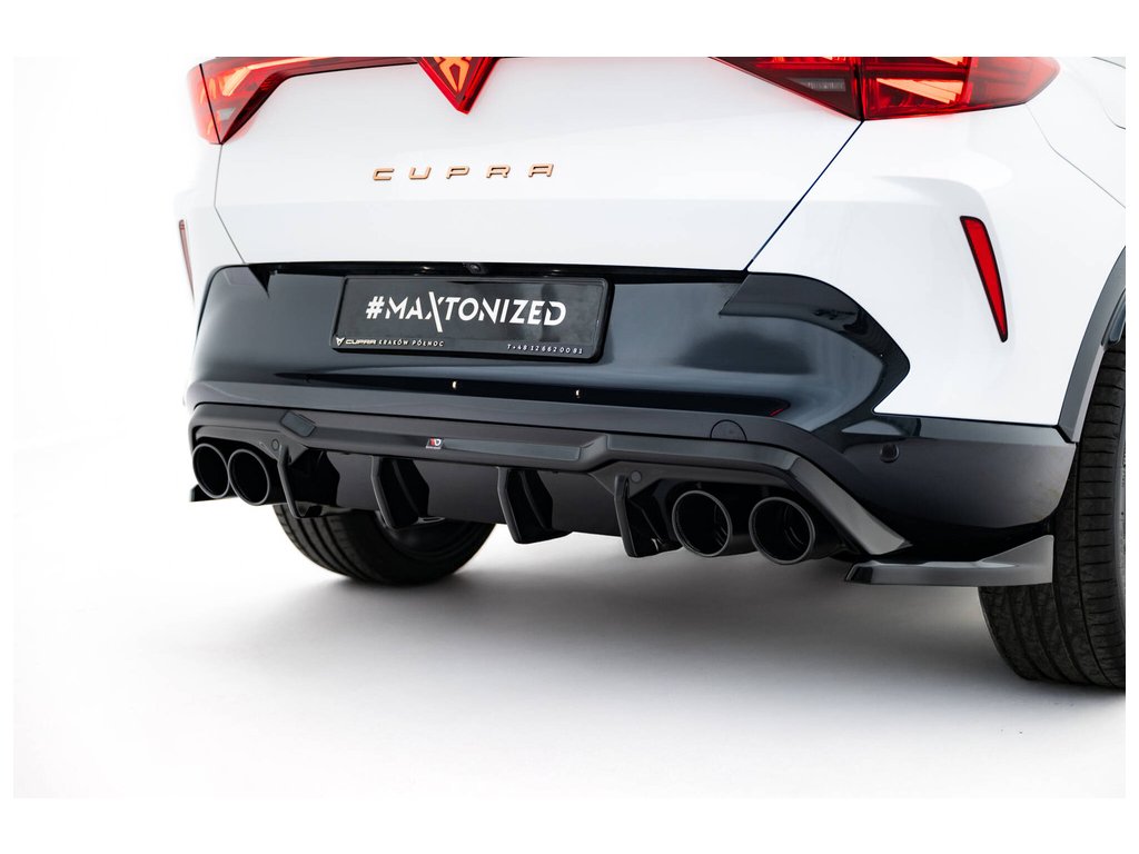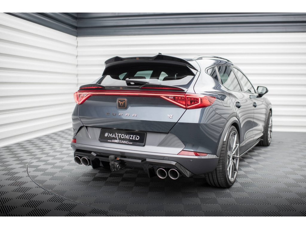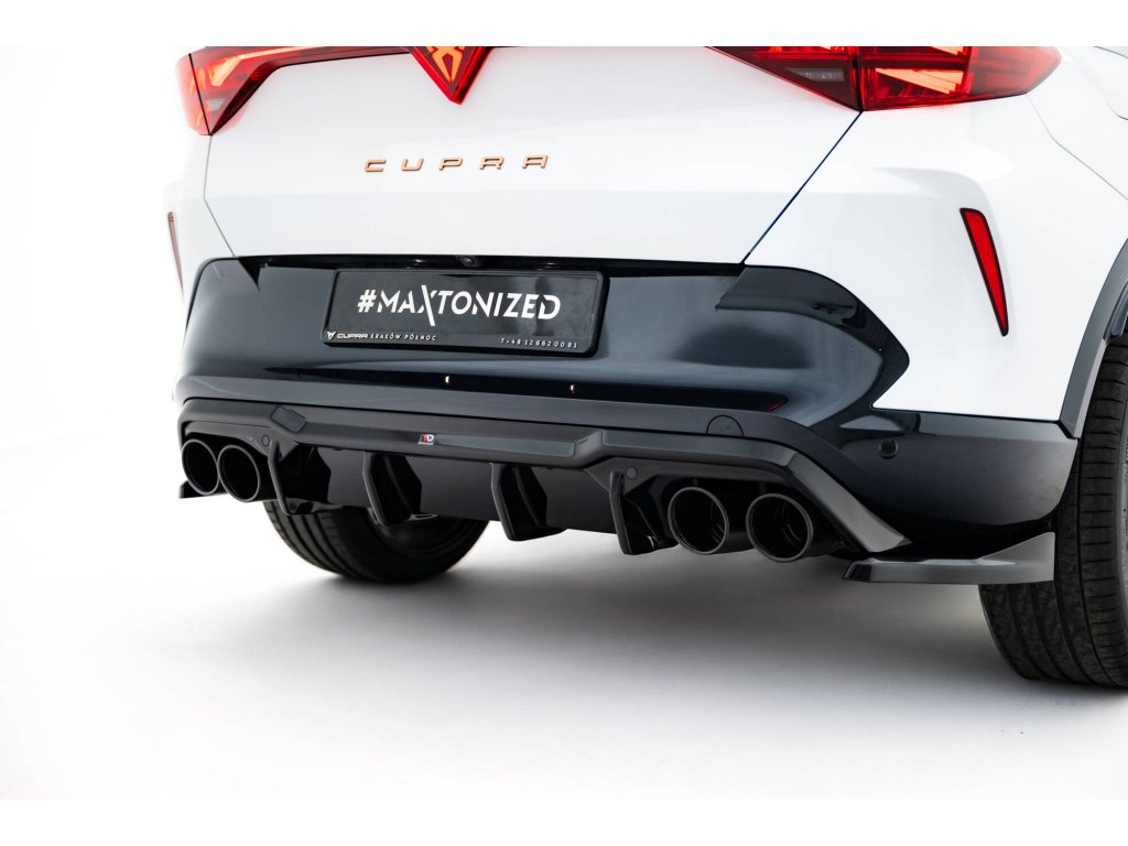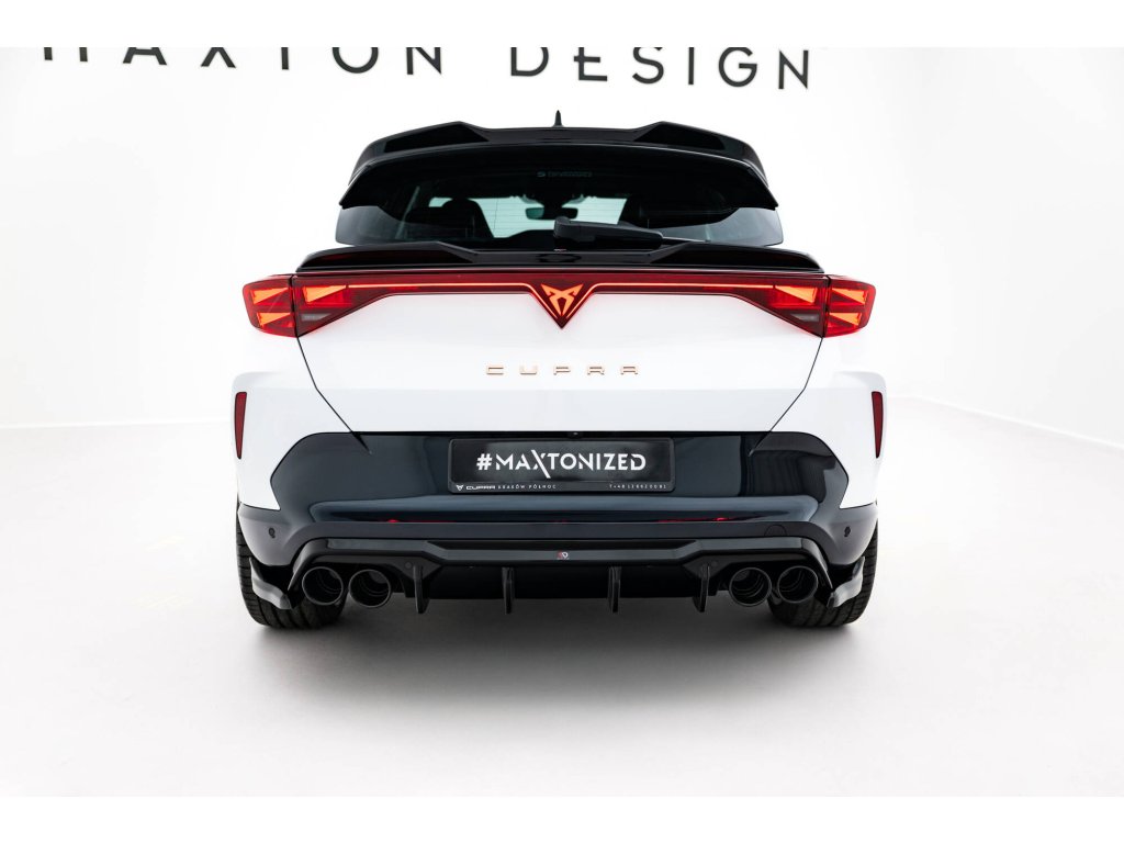 Maxton Design vložka zadního nárazníku ver.3 s imitacemi koncovek výfuku pro vozidlo Cupra Formentor Mk1 . Povrchová úprava spoileru černý lesklý plast ABS.