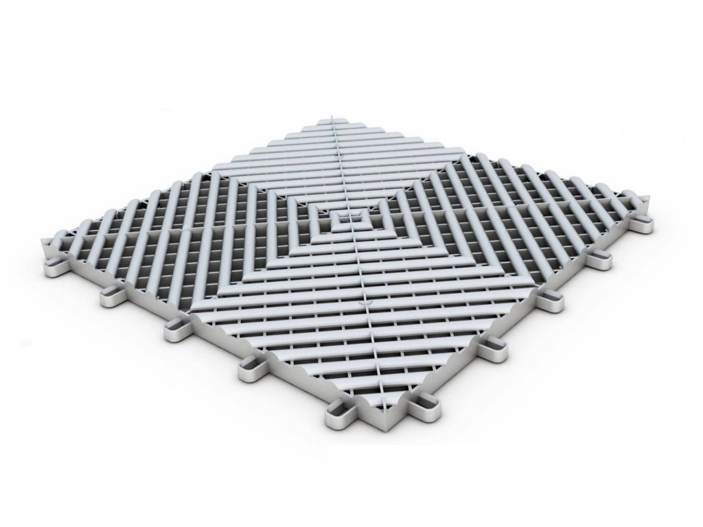 Dlaždice modulární plastové podlahy Maxton Floor vhodné pro garáže, dílny, detailingová studia, showroomy apod. Každá dlaždice má rozměr 33,3 x 33,3 cm (9 ks dlaždice tedy tvoří cca 1 m2). Tloušťka dlaždice je 1,6 cm.