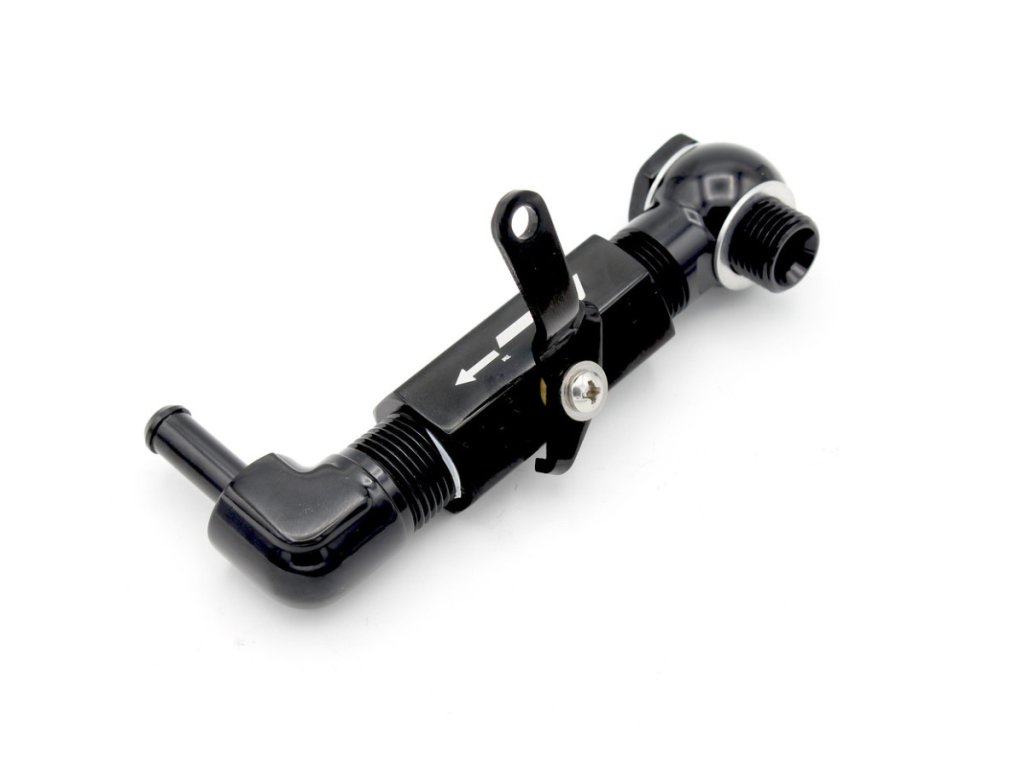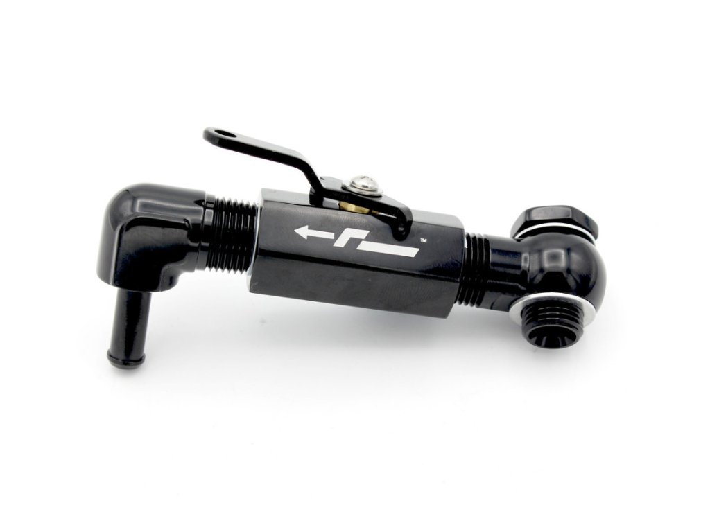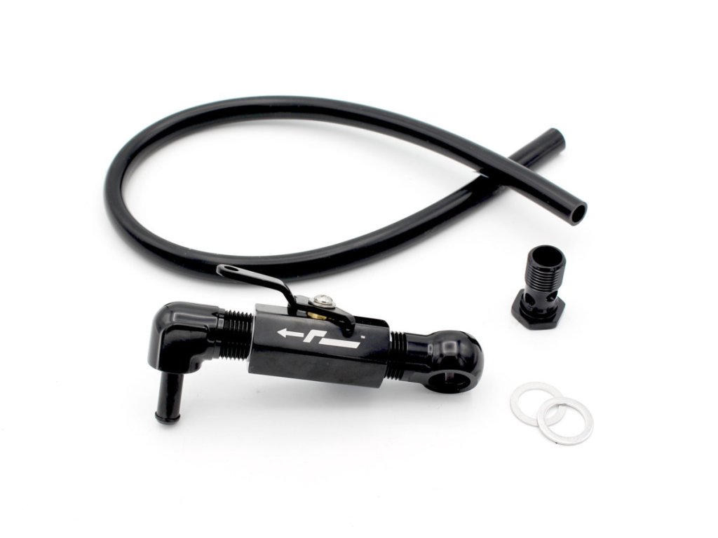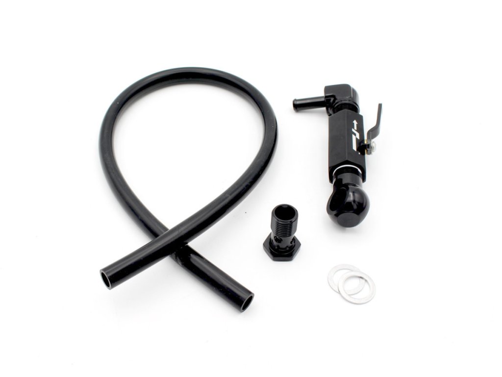 Kit v sobě obsahuje kuličkový ventil s pákovým ovládacím mechanismem pro snadnou manipulaci a 500 mm silikonové hadice pro usměrnění výtoku oleje z nádobky.