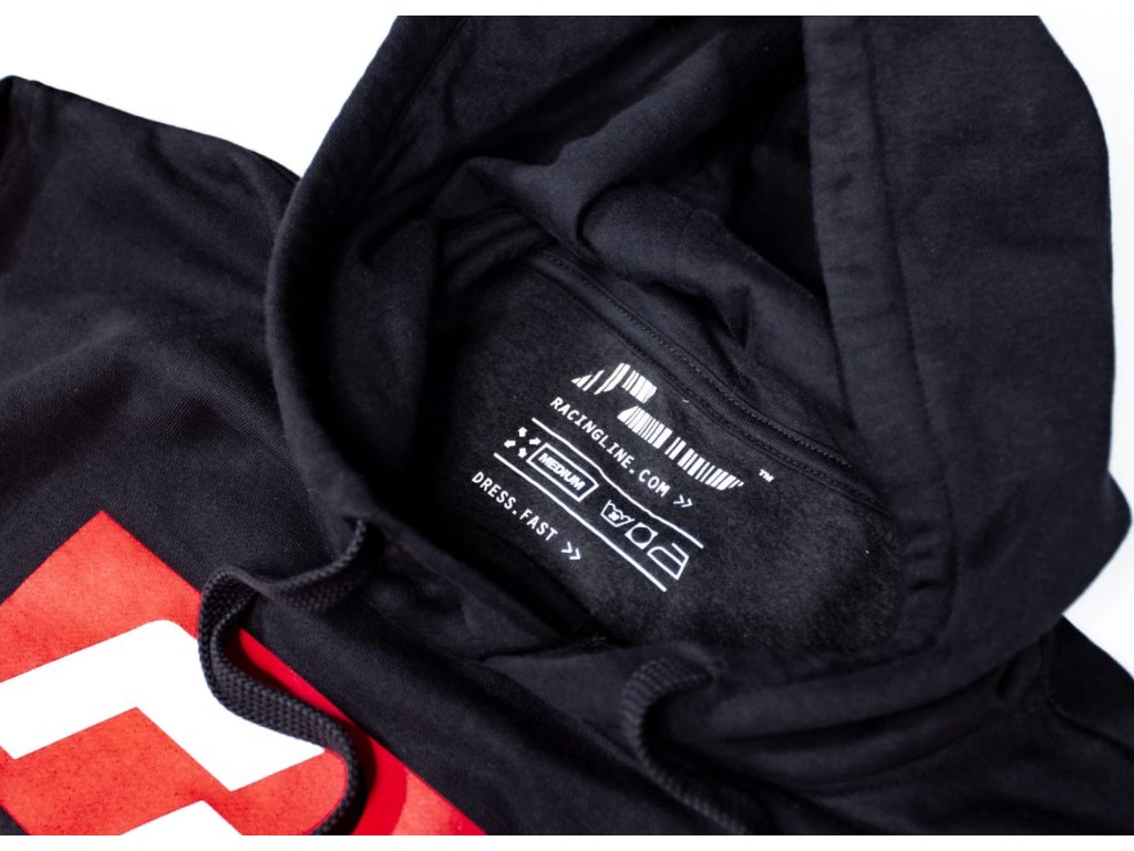 Originální unisex černá mikina s kapucou Racingline s červeným logem v rámečku vpředu a nápisem na zádech.
