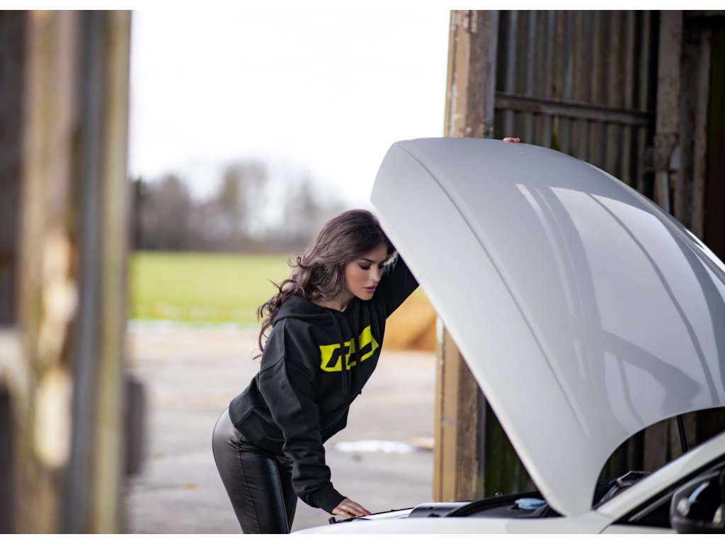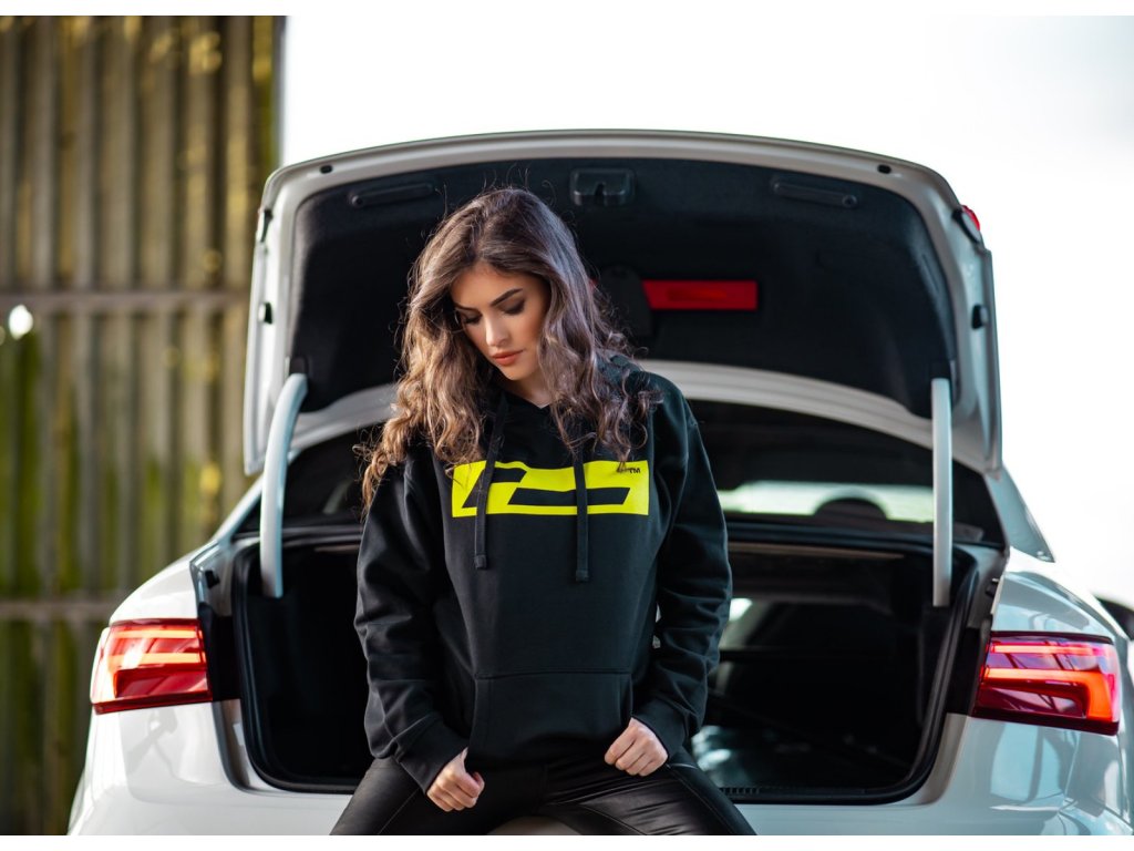 Originální unisex černá mikina s kapucou Racingline se žlutým logem v rámečku vpředu a nápisem na zádech.