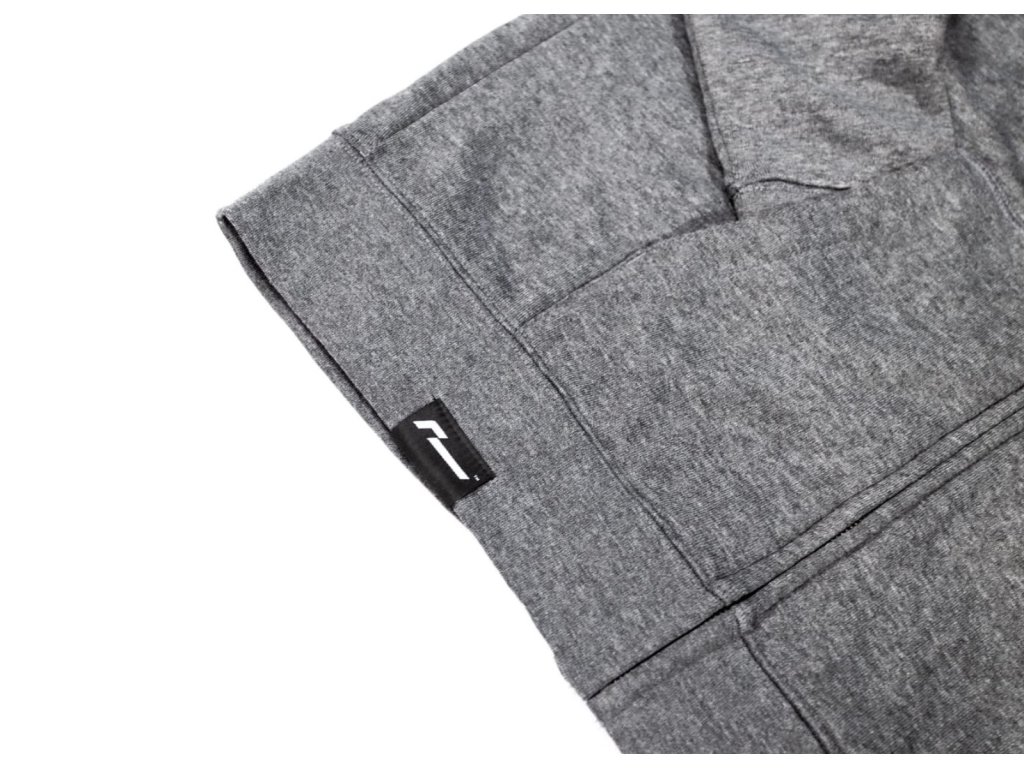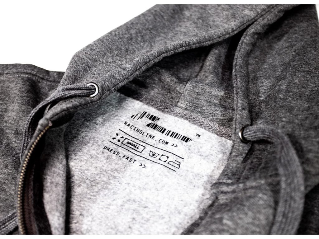 Originální unisex šedá mikina Racingline s kapucou a zipem s decentním černým logem vpředu a nápisem na zádech.